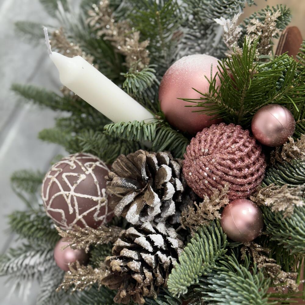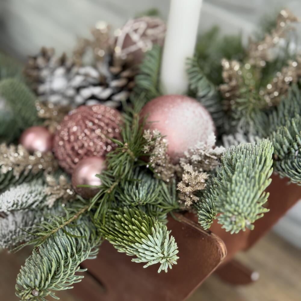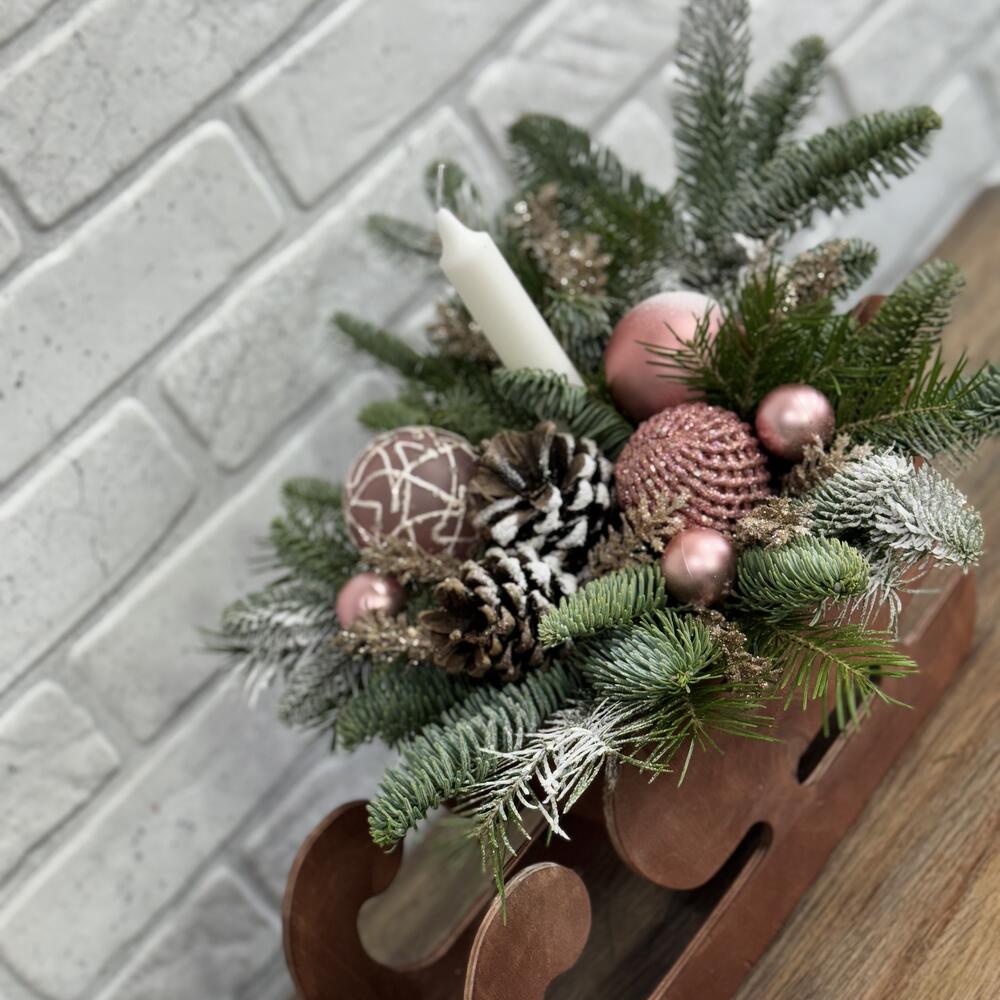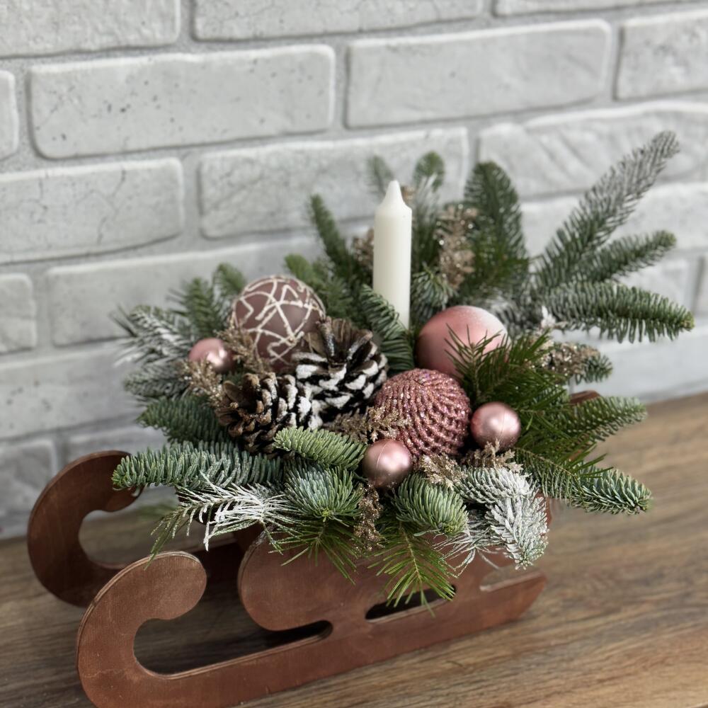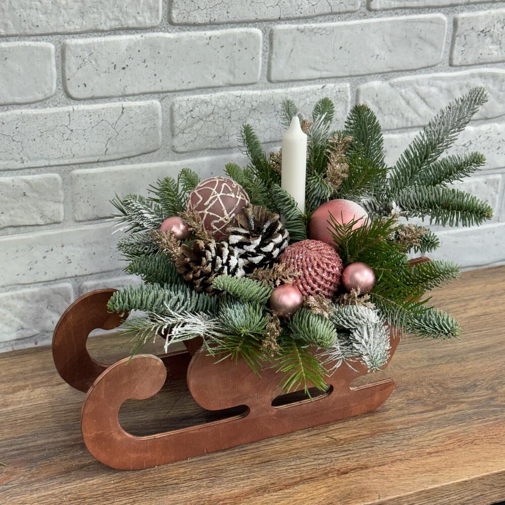 Сани деревянные Нобилис Свеча Игрушки Шишки Веточки декоративные Оазис Пихта