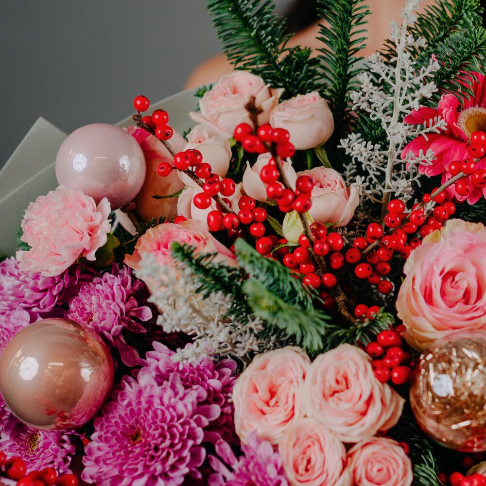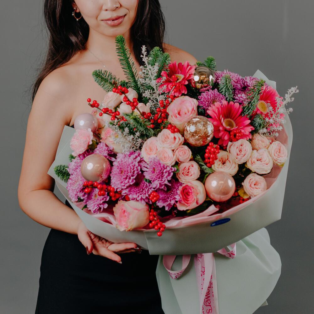 Илекс - 3 шт. Роза - 5 шт. Хризантема - 3 шт. Гвоздика - 1 шт. Гербера - 3 шт. Кохия - 3 шт. Нобилис - 1 шт. шар средний - 5 шт.