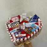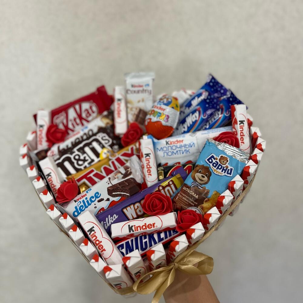 Сникерс - 1 шт. Твикс - 1 шт. Киндер шоколад - 40 шт. Барни - 1 шт. Яйцо киндерсюрприз - 1 шт. милка шоколад - 3 шт. буено - 1 шт. делис - 1 шт. марс конфеты - 1 шт.