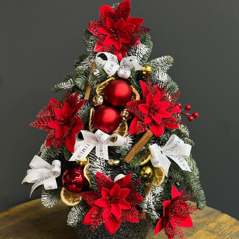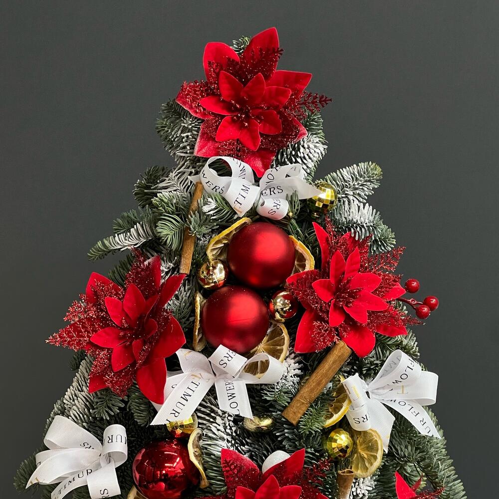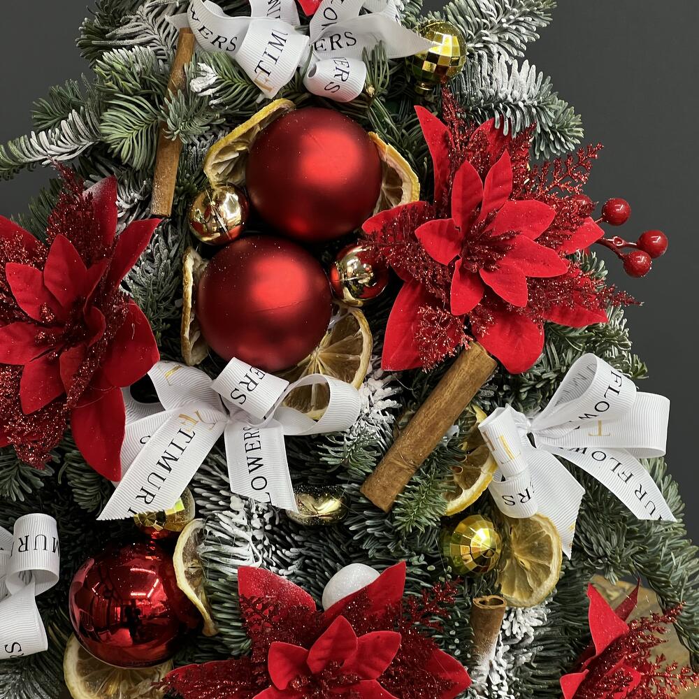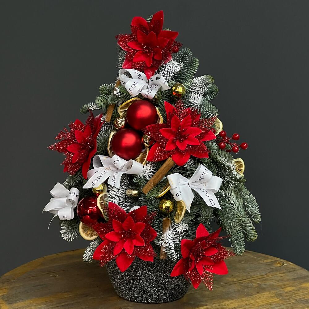 Кашпо - 1 шт. Декоративные ягоды - 1 шт. Нобилис - 4 шт. Новогодние игрушки - 9 шт. Декоративные цветы - 5 шт.