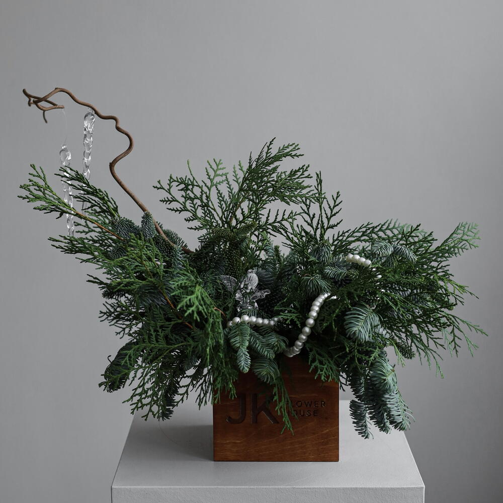 Зимняя композиция в деревянном кашпо из двух сортов хвои, с изысканным украшением Для поднятия новогоднего настроения 🩵