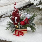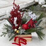 Рускус - 1 шт. Упаковка дизайнерская - 1 шт. Ящик деревянный - 1 шт. Новогодние игрушки - 3 шт. Оазис флористический - 1 шт. природный материал - 7 шт. илекс искусственный - 1 шт. пинус с размер - 3 шт. кипарис хс - 1 шт. нобилис хс размер - 2 шт.