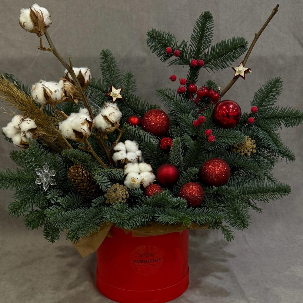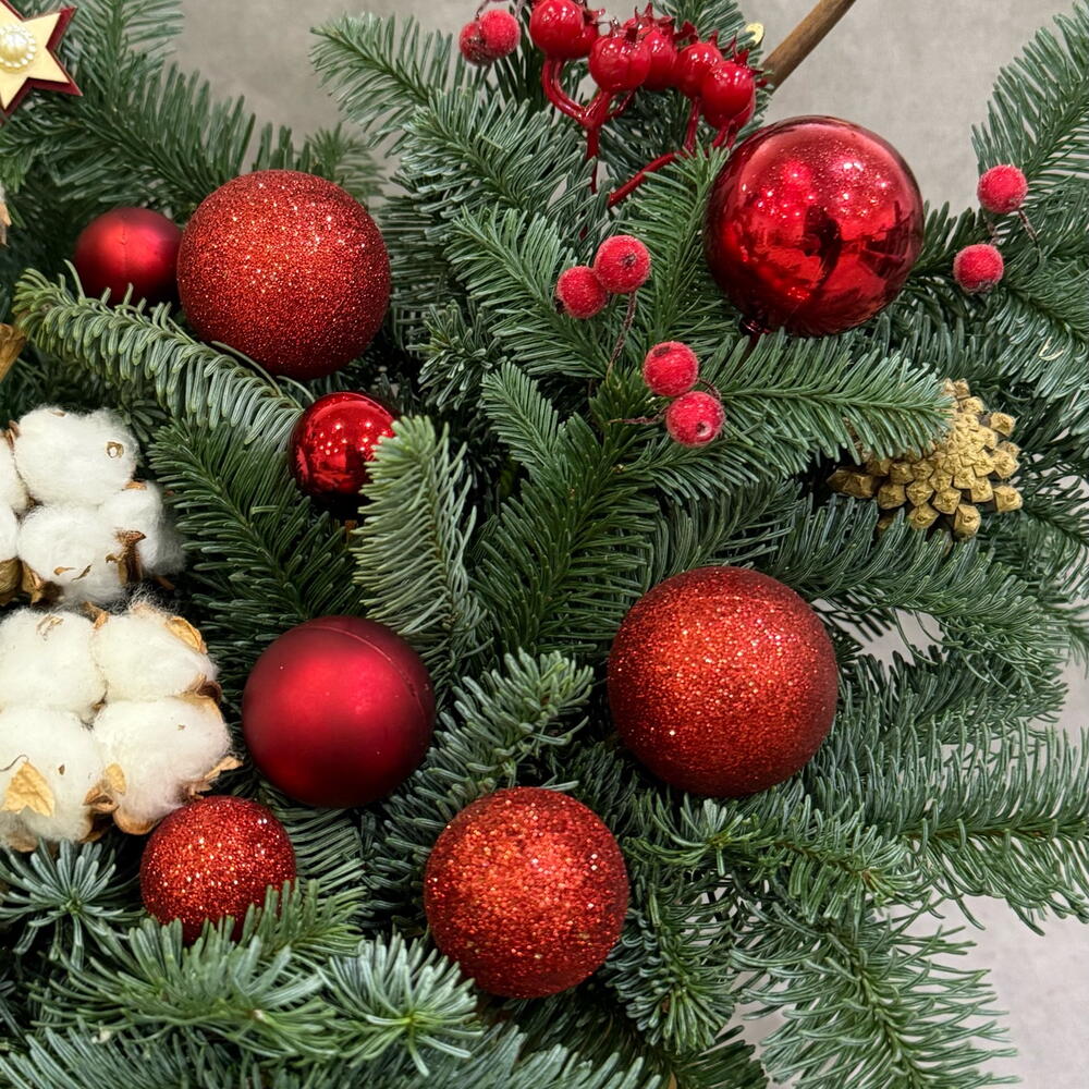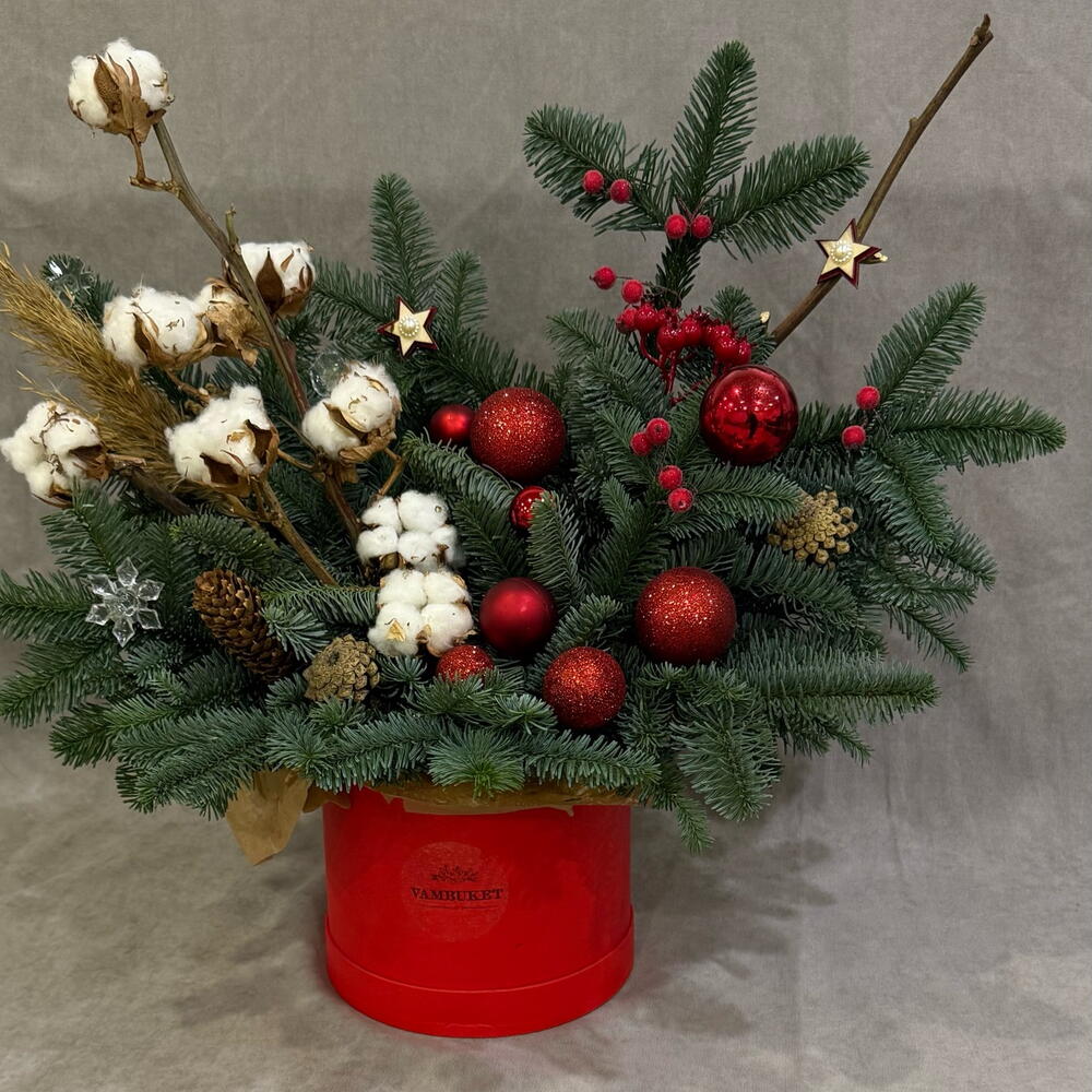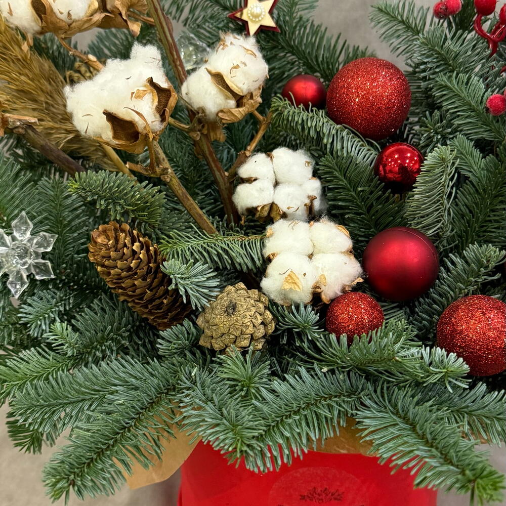 Роскошная композиция из натуральной хвои, хлопка и ярких красных акцентов-идеальный способ украсить дом к Новому году или подарить атмосферу праздника близким. Насыщенный красный цвет, блестящие шары, зимние веточки и пушистый хлопок создают ощущение тепла, уюта и волшебства. Такая композиция выглядит эффектно в любой комнате-от гостиной до рабочего кабинета. 🎀 Долговечная: будет радовать 3–4 недели