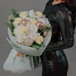 Гортензия - 2 шт. Роза - 2 шт. Хризантема - 2 шт. Гвоздика - 6 шт. Шары - 4 шт. Нобилис - 1 шт.