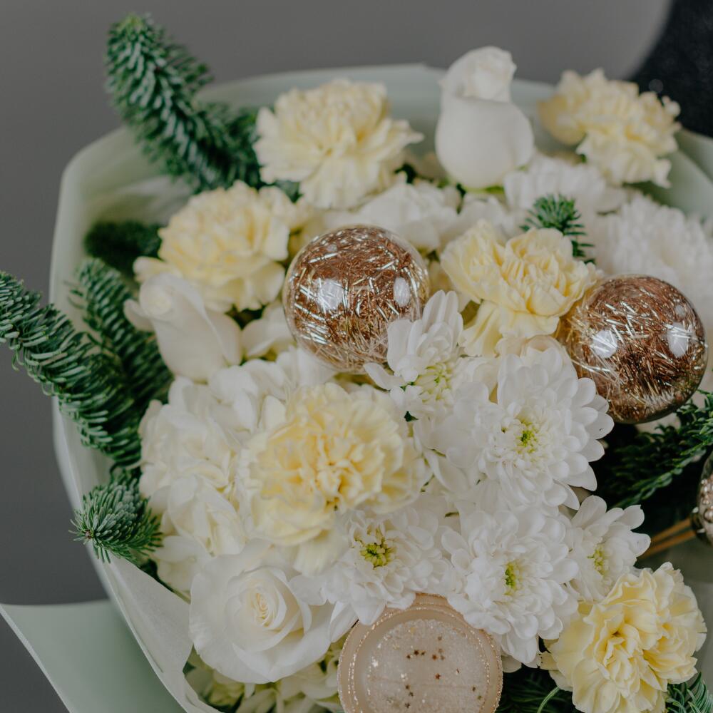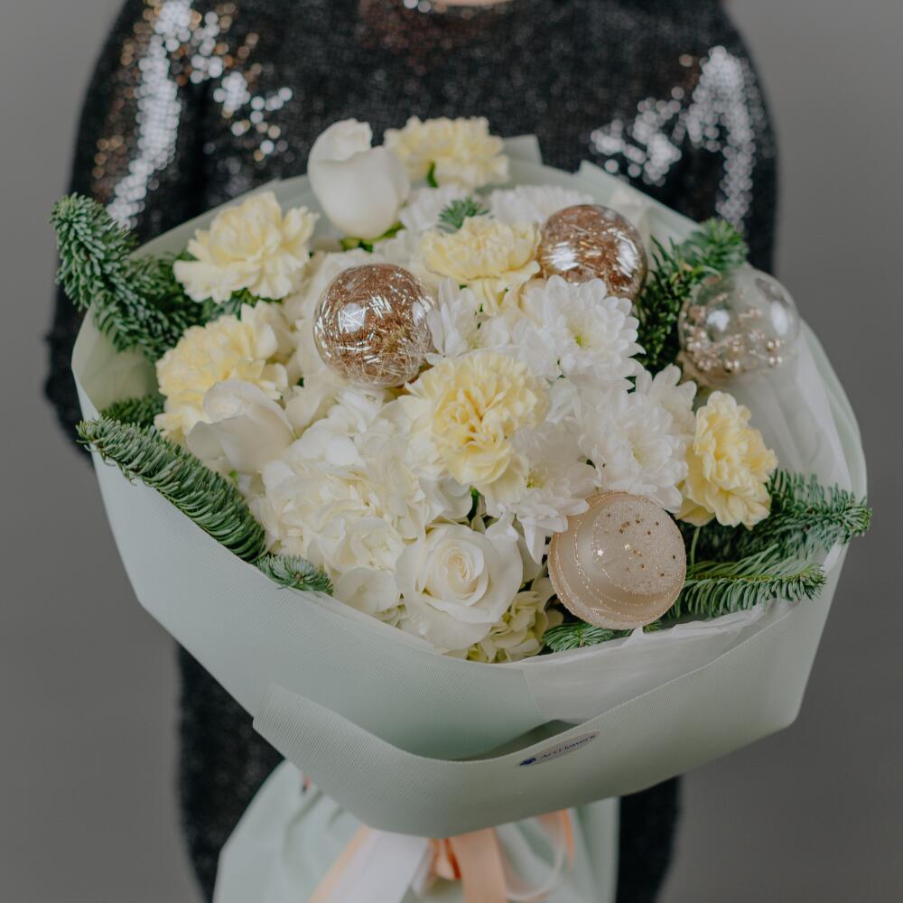 Гортензия - 2 шт. Роза - 2 шт. Хризантема - 2 шт. Гвоздика - 6 шт. Шары - 4 шт. Нобилис - 1 шт.
