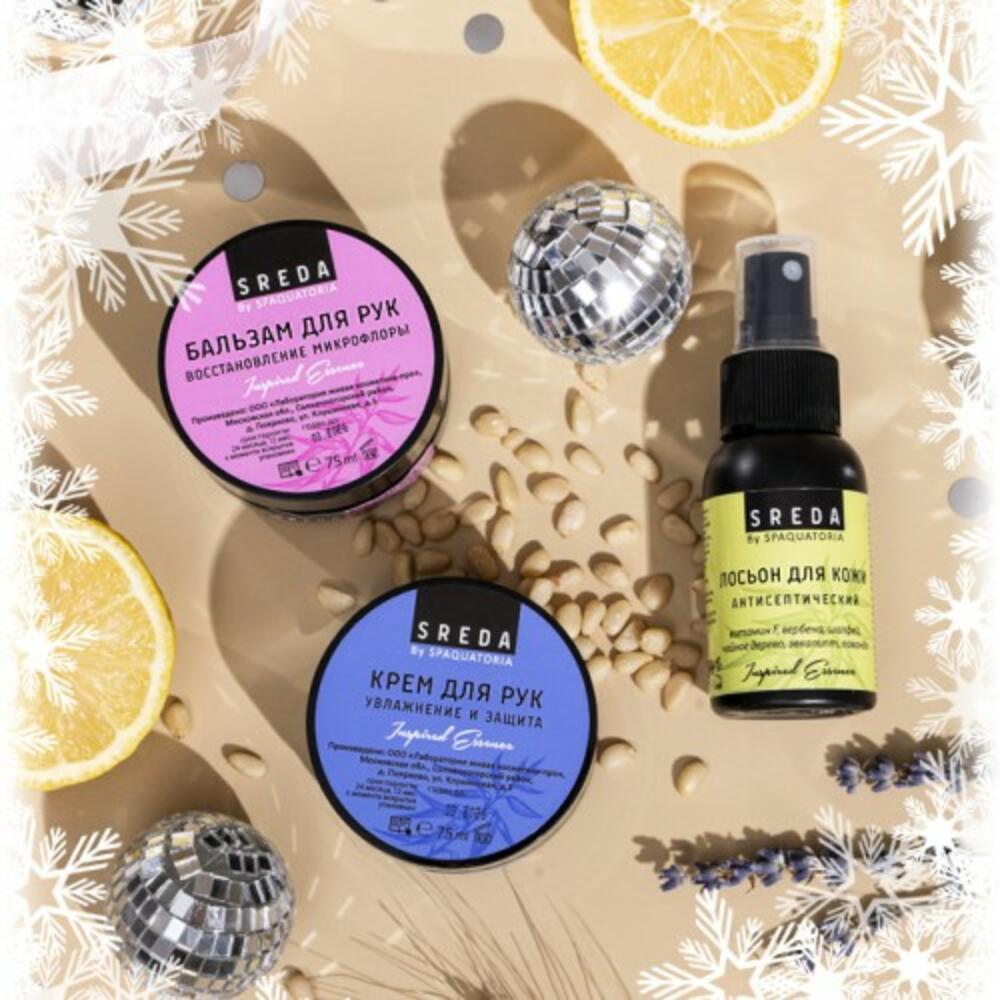 АРОМА ЛОСЬОН SREDA 50 мл Сocтав (INCI): ISOPROPYL ALCOHOL, GLYCERIN, AQUA, ROSMARINUS OFFICINALIS EXTRACT, THYMUS VULGARIS EXTRACT, ORIGANUM VULGARE EXTRACT, AMORPHOPHALLUS KONJAC ROOT EXTRACT, ETHYL ETHERS OF UNSATURATED FATY ACIDS (LINOLEIC ACID AND LINOLENIC ACID), SODIUM LACTATE, ESSENTIAL OILS: MELALEUCA ALTERNIFOLIA, SALVIA SCLAREA, LAVANDULA ANGUSTIFOLIA, LIPPIA CITRIODORA LEAF, EUCALYPTUS GLOBULUS LEAF. Крем для рук SREDA 75 мл Сocтав (INCI): AQUA, GLYCERIN, VITIS VINIFERA (GRAPE) SEED OIL, BUTYROSPERMUM PARKII (SHEA BUTTER) OIL, SIMMONDSIA CHINENSIS (JOJOBA) SEED OIL, LAMINARIA DIGITATA EXTRACT, FUСUS VESICULOSUS EXTRACT, ALOE BARBADENSIS (ALOE VERA) LEAF GEL, DICAPRYLYL ETHER, ETHYLHEXYL STEARATE, ETHYL ETHERS OF UNSATURATED FATY ACIDS (LINOLEIC ACID AND LINOLENIC ACID), STEARIC ACID, EMULSIFYING WAX, DISTILLED MONOGLYCERIDE, CALCIUM LACTATE, HYDROLYZED WHEAT, HYDROLYZED RYE, HYDROLYZED OAT PROTEINS, UREA, CARBOMER, TOCOPHEROL ACETATE, BENZYL ALCOHOL, ETHYLHEXYLGLYCERIN, SODIUM HYDROXIDE, ESSENTIAL OILS: CITRUS BERGAMIA, LIPPIA CITRIODORA LEAF, SALVIA SCLAREA, CEDRUS ATLANTICA BARK, CITRUS LIMONUM, GLYCINE SOJA (SOYBEAN) OIL (AND) ROSMARINUS OFFICINALIS. Бальзам для рук SREDA 75 мл Сocтав (INCI): AQUA WITH INFUSION OF BIDENS TRIPARTITA, CHAMOMILLA RECUTITA (MATRICARIA) FLOWER, CALENDULA OFFICINALIS FLOWER, BUTYROSPERMUM PARKII (SHEA BUTTER) OIL, COPERNICIA CERIFERA (CARNAUBA) WAX, GLYCERIN, SESAMUM INDICUM SEED, THEOBROMA CACAO SEED BUTTER, DICAPRYLYL ETHER, ETHYLHEXYL STEARATE, ETHYL ETHERS OF UNSATURATED FATY ACIDS (LINOLEIC ACID AND LINOLENIC ACID), STEARIC ACID, EMULSIFYING WAX, DISTILLED MONOGLYCERIDE, TOCOPHEROL ACETATE, LACTOBIOTYL® (LACTOBACILLUS ARIZONENSIS), BENZYL ALCOHOL, ETHYLHEXYLGLYCERIN, SODIUM HYDROXIDE, ESSENTIAL OILS: LAVANDULA ANGUSTIFOLIA, CANANGA ODORATA, CYMBOPOGON MARTINI, LITSEA CUBEBA, GLYCINE SOJA (SOYBEAN) OIL (AND) ROSMARINUS OFFICINALIS.