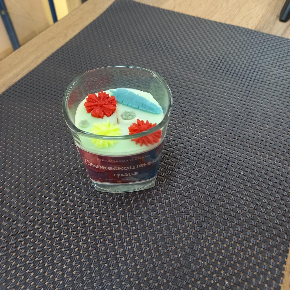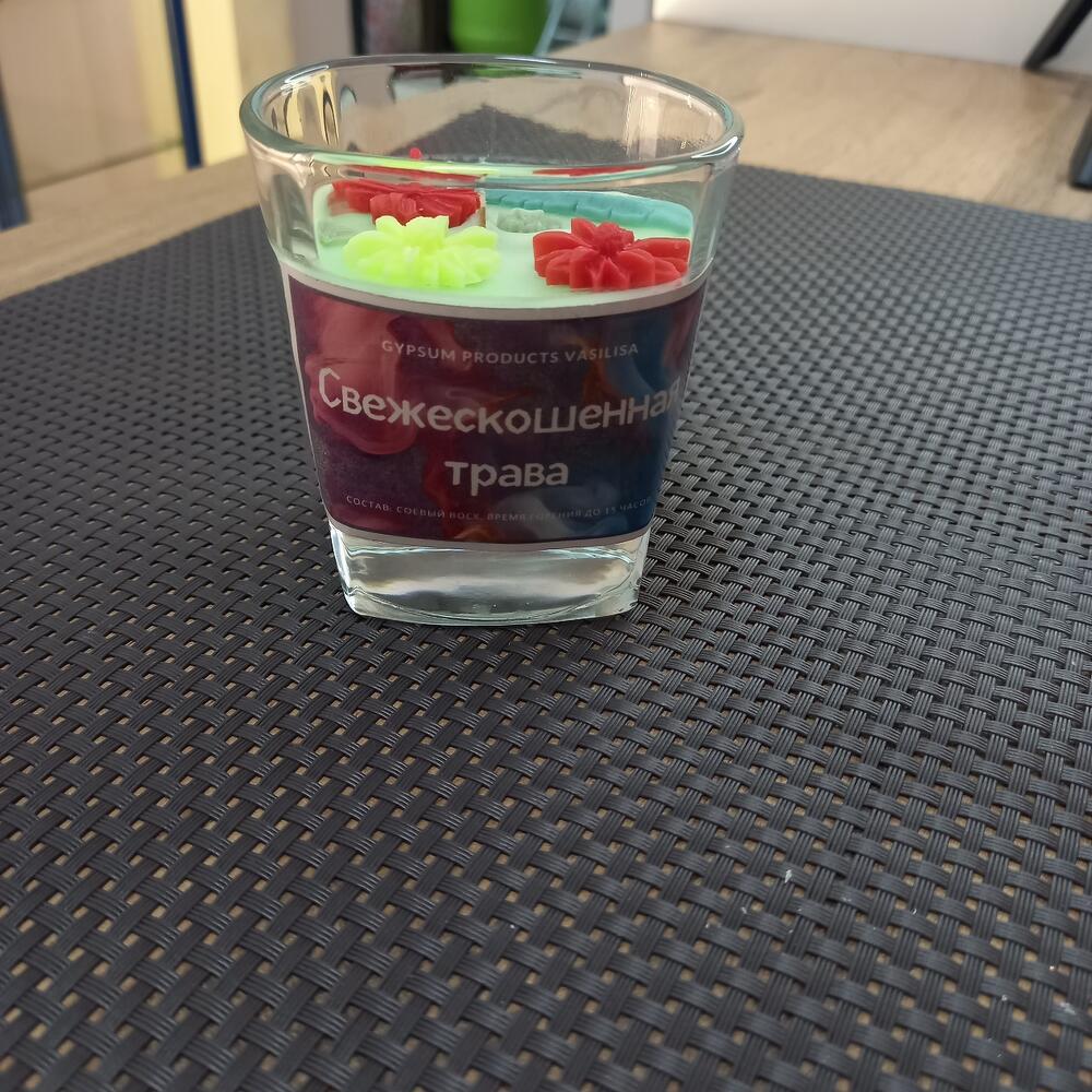 Арома-свеча. Аромат - свежескошенная трава. Материал подсвечника - стекло. Материал свечи - соевый воск. Фитиль - деревянный. Объём 100мл. Время горения до 15 часов.