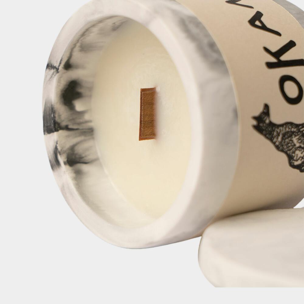 Ароматические свечи выполнены Okami из экологически чистых материалов: 1. Гипс - натуральный минерал; 2. Соевый и кокосовый воск - природные материалы, которые при горении не выделяют токсичных веществ; 3. Сертифицированные ароматические масла производства США. На выбор имеются 6 ароматов: 1- Дымный уд - тёплый древесный букет, создающий умиротворенную и загадочную атмосферу. Верхние ноты: ладан, мята Средние ноты: дым Базовые ноты: ладан, мирра, янтарь, мускус и кожа. 2- Красное дерево Ши - аромат роскоши и богатства. Верхние ноты: миндаль Средние ноты: масло ши, кокос, янтарь Базовые ноты: сандаловое дерево, кедр, мускус, тонка, древесина 3- Пряный имбирь - создает атмосферу праздника. Верхние ноты: лимон, апельсин Средние ноты: имбирь, сахар Базовые ноты: ваниль, корица, гвоздика, мускатный орех, душистый перец. 4- Карамельный попкорн - насыщенный сладкий аромат. Верхние ноты: сливочное масло, морская соль Средние ноты: попкорн, кокос Базовые ноты: ваниль, карамель. 5- Ванильное мороженое - сладкий аромат. Верхние ноты: сливочный крем Средние ноты: ваниль, торт Базовые ноты: сахар, бурбон. 6- Жареный кокос - нежный аромат Баунти. Верхние ноты: кокосовое молоко, миндаль Средние ноты: кокос, карамелизированный сахар Базовые ноты: кокосовое молоко, бобы тонка, сливки.