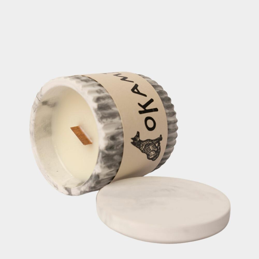 Ароматические свечи выполнены Okami из экологически чистых материалов: 1. Гипс - натуральный минерал; 2. Соевый и кокосовый воск - природные материалы, которые при горении не выделяют токсичных веществ; 3. Сертифицированные ароматические масла производства США. На выбор имеются 6 ароматов: 1- Дымный уд - тёплый древесный букет, создающий умиротворенную и загадочную атмосферу. Верхние ноты: ладан, мята Средние ноты: дым Базовые ноты: ладан, мирра, янтарь, мускус и кожа. 2- Красное дерево Ши - аромат роскоши и богатства. Верхние ноты: миндаль Средние ноты: масло ши, кокос, янтарь Базовые ноты: сандаловое дерево, кедр, мускус, тонка, древесина 3- Пряный имбирь - создает атмосферу праздника. Верхние ноты: лимон, апельсин Средние ноты: имбирь, сахар Базовые ноты: ваниль, корица, гвоздика, мускатный орех, душистый перец. 4- Карамельный попкорн - насыщенный сладкий аромат. Верхние ноты: сливочное масло, морская соль Средние ноты: попкорн, кокос Базовые ноты: ваниль, карамель. 5- Ванильное мороженое - сладкий аромат. Верхние ноты: сливочный крем Средние ноты: ваниль, торт Базовые ноты: сахар, бурбон. 6- Жареный кокос - нежный аромат Баунти. Верхние ноты: кокосовое молоко, миндаль Средние ноты: кокос, карамелизированный сахар Базовые ноты: кокосовое молоко, бобы тонка, сливки.