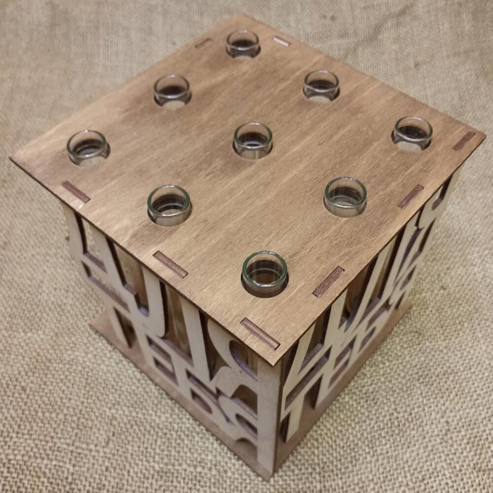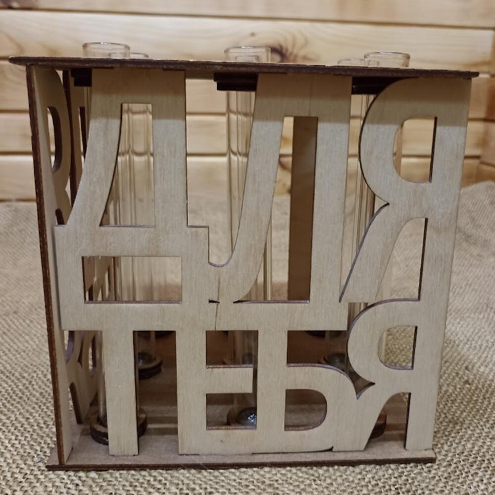 Этот изящный бокс из берёзовой фанеры – больше, чем просто украшение интерьера. Это способ выразить свои чувства без лишних слов. Стенки бокса, составленные из слов для тебя, несут в себе теплоту и заботу, делая его идеальным подарком для близкого человека. Внутри бокса расположены стеклянные колбы, готовые принять в себя яркие краски живых цветов или изящество сухоцветов. Создайте свой уникальный флористический ансамбль, который будет радовать глаз и наполнять дом уютом. Бокс Для тебя – это универсальный подарок, который подойдет к любому случаю. Он станет прекрасным украшением для дома, офиса или студии, а также символом вашей любви, дружбы или признательности. Стеклянные лабораторные колбы входят в комплект. Изделие выполнено только из экологичных материалов, и окрашено натуральными пропитками. Количество колб: 9 штук. Размер (Ш * Г * В): 15 * 15 * 15 см Размер колб: 16 * 150 мм