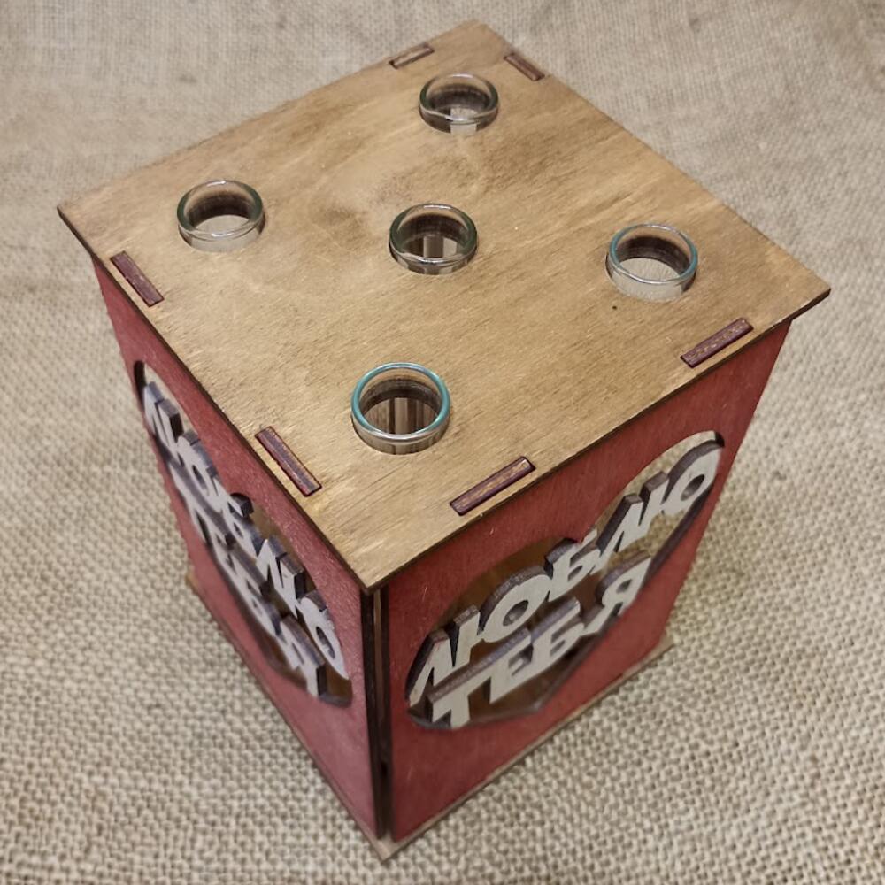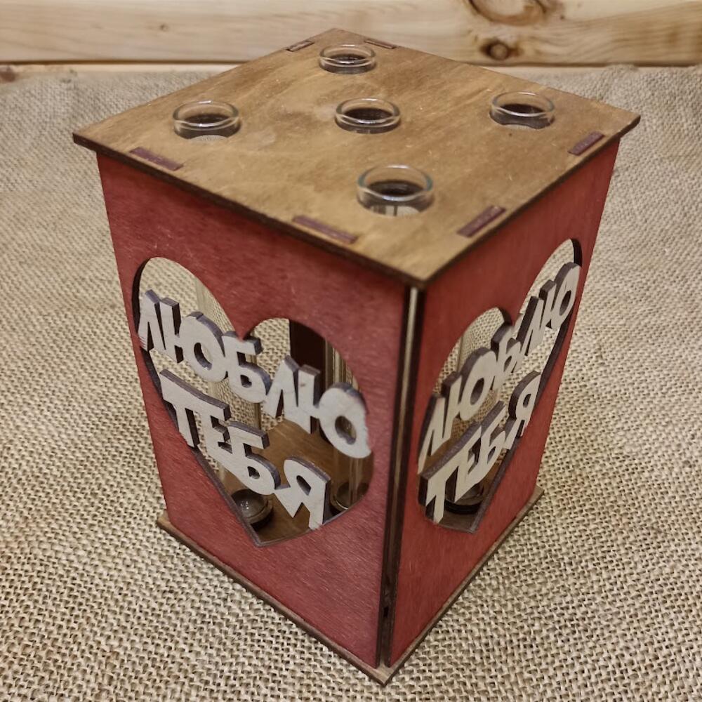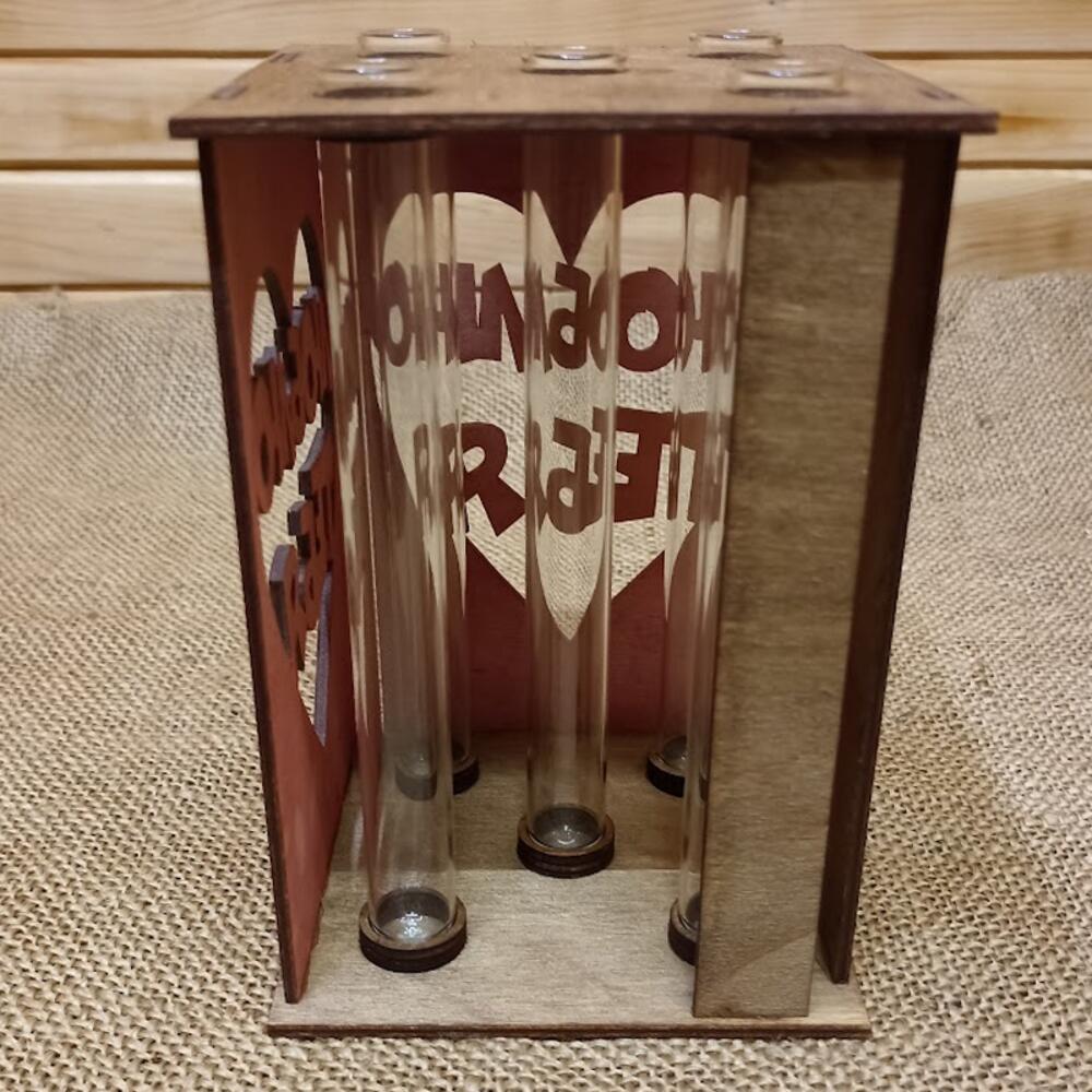 Декоративный бокс с колбами из стекла - это уникальное украшение для любого интерьера. Изготовленный из натуральной берёзовой фанеры, он придаст вашему дому особый шарм и уют. Колбы предназначены для размещения в них живых цветов или сухоцветов, создавая при этом неповторимую атмосферу свежести и красоты. Особенностью этого декоративного бокса является его оформление - вырезанное в стенках сердце, внутри которого вырезаны слова люблю тебя. Этот романтичный акцент делает этот предмет не просто декором, но и знаком искренних чувств и нежности. Этот бокс станет прекрасным подарком для любимого человека или родного человека, напоминая о любви и заботе каждый день. Бокс с колбами и сердцем люблю тебя станет не только стильным дополнением к вашему интерьеру, но и источником вдохновения и радости. Позвольте этому декоративному боксу наполнить ваш дом теплом и уютом, напоминая о важности гармонии и взаимопонимания в жизни. Стеклянные лабораторные колбы входят в комплект. Изделие выполнено только из экологичных материалов, и окрашено натуральными пропитками. Количество колб: 5 штук. Размер (Ш * Г * В): 10 * 10 * 15 см Размер колб: 16 * 150 мм