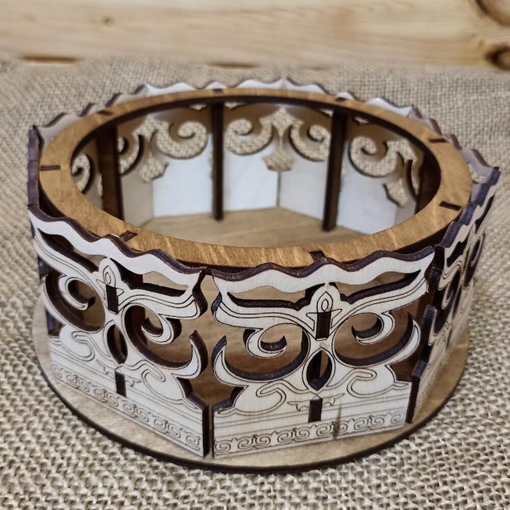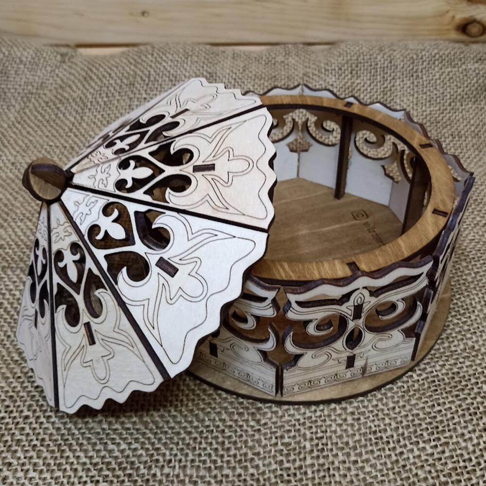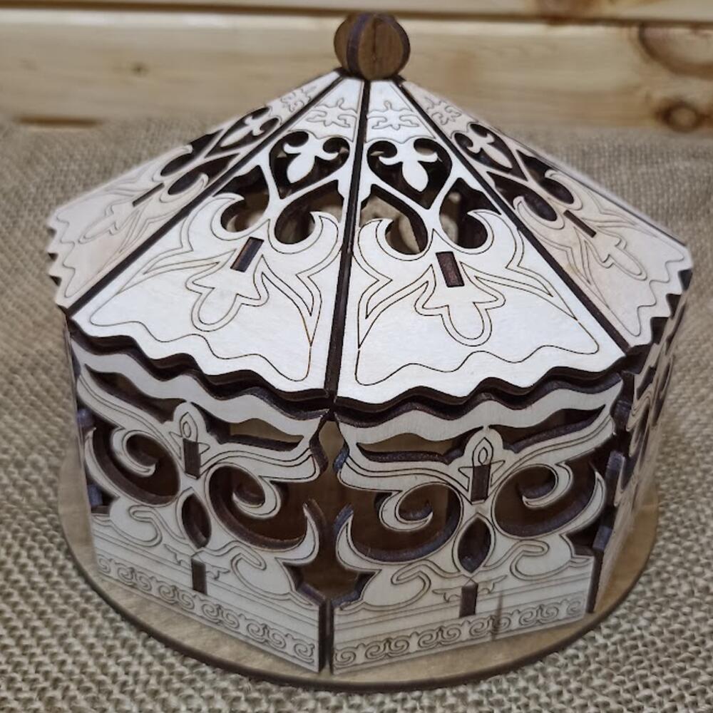 Вазочка в форме юрты из сочетает в себе традиционные национальные мотивы и современный дизайн. Этот изящный предмет интерьера отражает богатое наследие культуры кочевников и является символом тепла и уюта в доме. Изготовленная из натуральной фанеры, вазочка в форме юрты имеет сложную резьбу и декоративные элементы, которые подчеркивают ее уникальность и красоту. Это прекрасное дополнение к любому интерьеру, особенно тем, которые стилизованы в национальном стиле. Изделие выполнено только из экологичных материалов, и окрашено натуральными пропитками.
