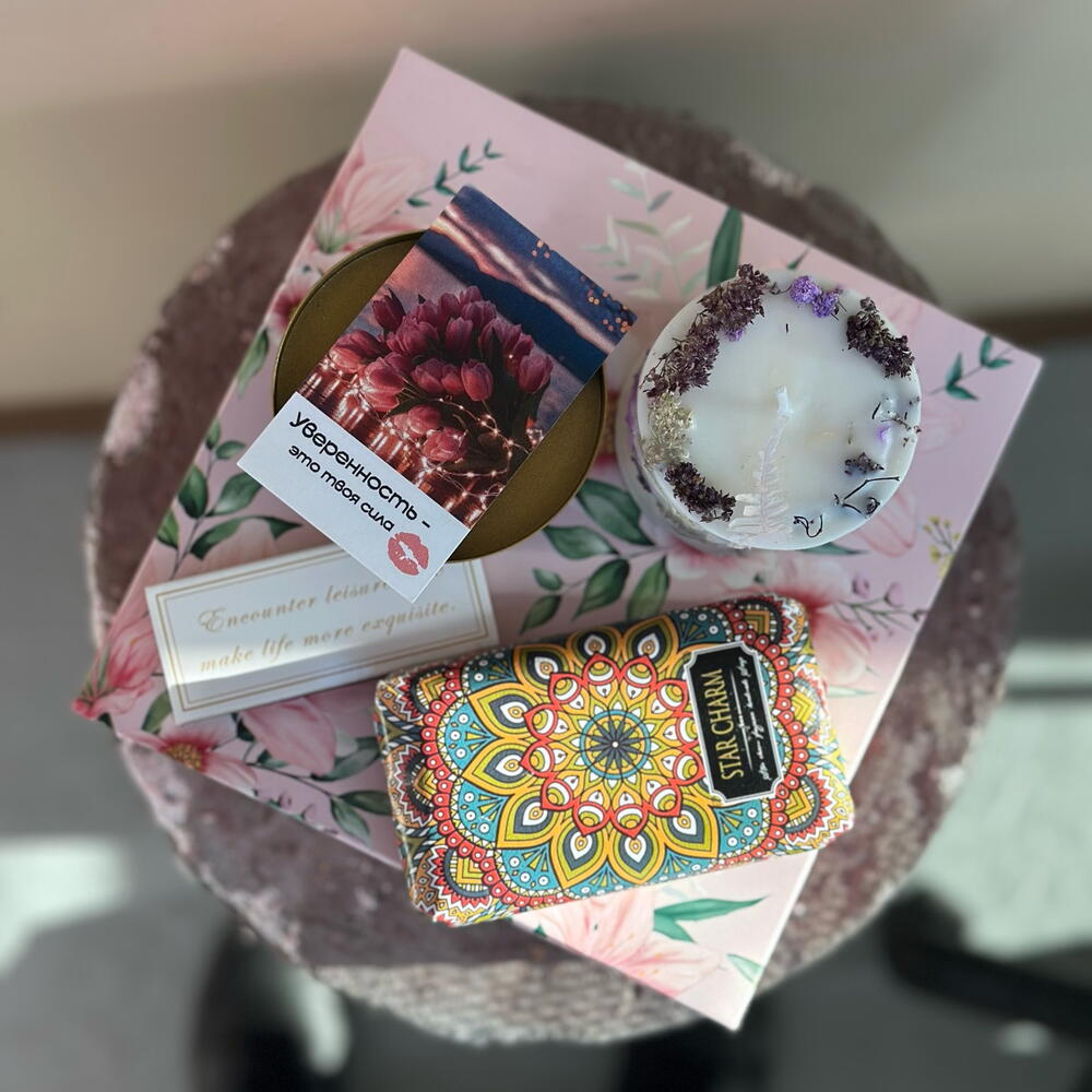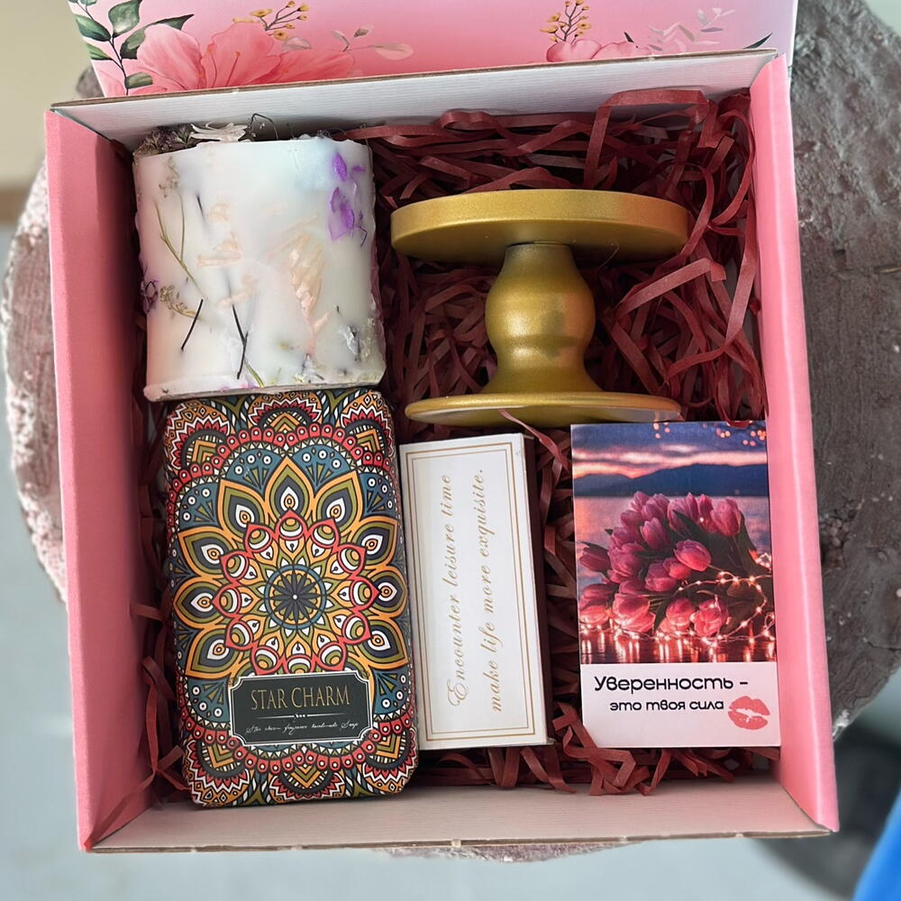 Ручной работы ароматная свеча с добавлением натуральных сухоцветов, свеча состоит из двух материалов, наполнение восковое, стакан из парафина! В подарок так же в комплекте идет ароматное мыло, подсвечник, спички и открытка с пожеланием!