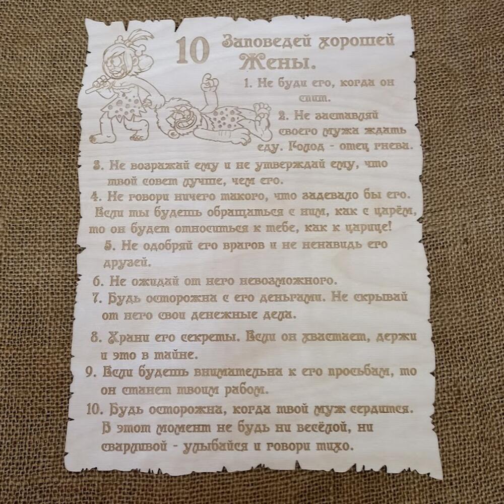 Настенная табличка 10 заповедей жены из берёзовой фанеры – это оригинальный и шутливый способ напомнить женщине о ее семейных обязанностях. Лазерная гравировка позволяет нанести на табличку десять забавных заповедей, которые вызовут улыбку и поднимут настроение. Табличка изготовлена из экологически чистой берёзовой фанеры, что придает ей природную теплоту и шарм. Лазерная гравировка обеспечивает высокую точность и детализацию изображения, а также долговечность надписи. Крепления на задней стороне таблички позволяют легко и надежно зафиксировать ее на стене. Вы можете разместить табличку в спальне, гостиной или прихожей, чтобы создать атмосферу юмора и взаимопонимания в семье. Изделие выполнено только из экологичных материалов. Внешний размер (Ш * В): 22 * 30 см