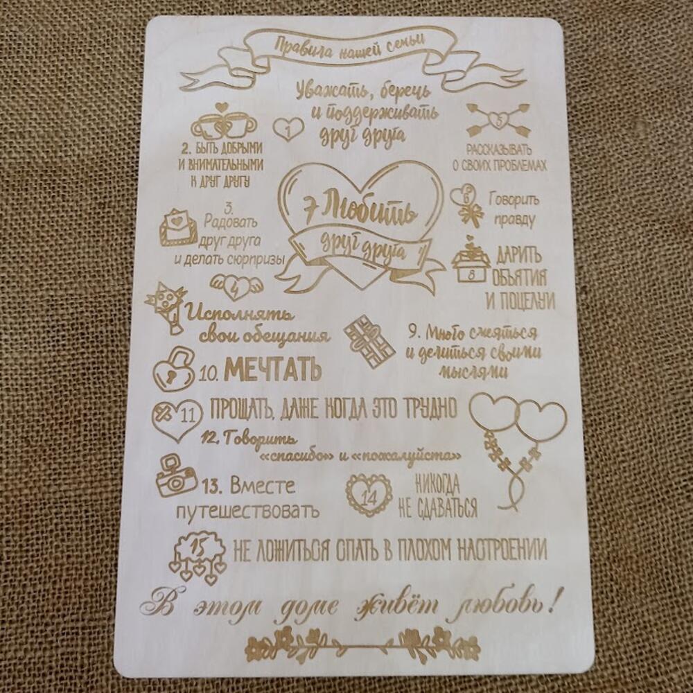 Настенная табличка Правила нашей семьи из берёзовой фанеры – это не просто элемент декора, а символ единства, любви и взаимопонимания. Лазерная гравировка позволяет нанести на табличку важные для вашей семьи ценности, традиции и правила, которые помогут создать гармоничную атмосферу в доме. Табличка изготовлена из экологически чистой берёзовой фанеры, что придает ей природную теплоту и шарм. Лазерная гравировка обеспечивает высокую точность и детализацию изображения, а также долговечность надписи. Крепления на задней стороне таблички позволяют легко и надежно зафиксировать ее на стене. Вы можете разместить табличку в гостиной, кухне или прихожей, чтобы она всегда напоминала всем членам семьи о важности взаимоуважения, поддержки и любви. Настенная табличка Правила нашей семьи станет отличным подарком для новоселов, молодоженов или любой семьи, которая ценит свои традиции и стремится к гармонии. Изделие выполнено только из экологичных материалов. Внешний размер (Ш * В): 20 * 30 см
