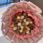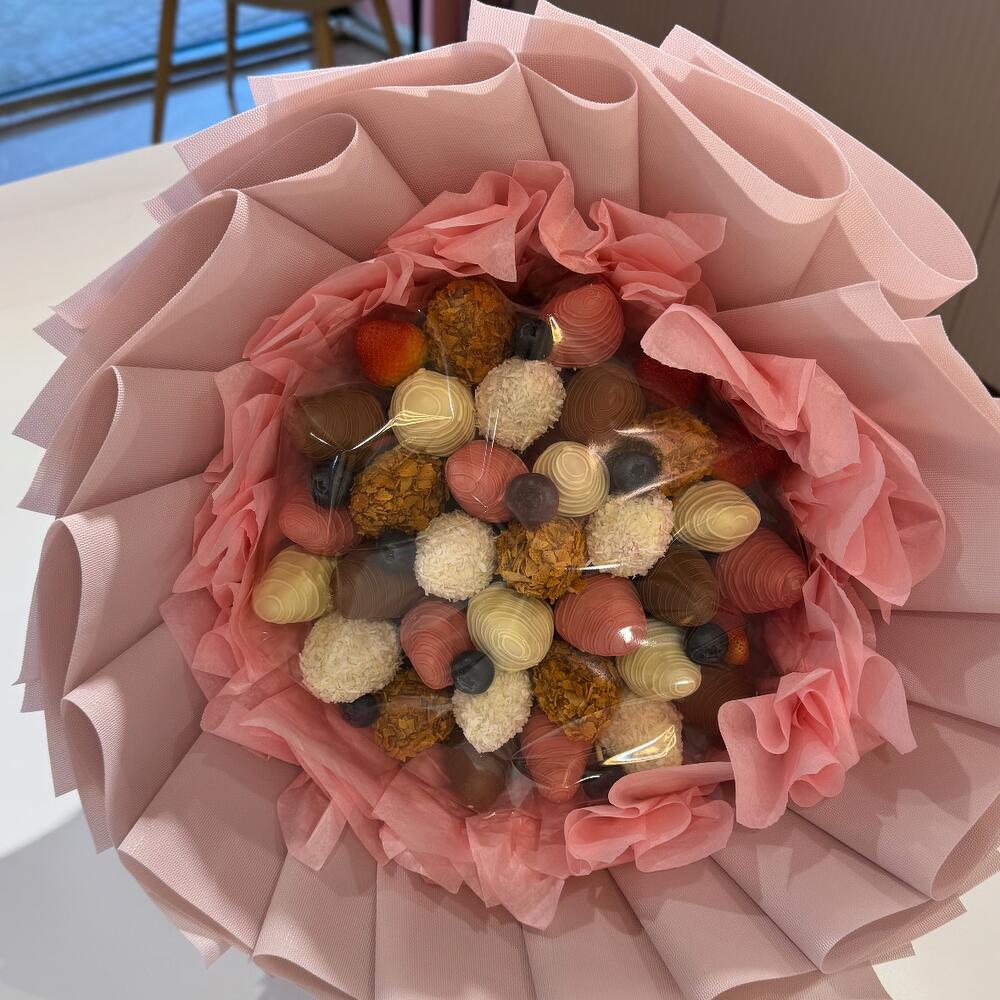 Роскошный съедобный букет из свежей клубники, покрытой шоколадом, с добавлением голубики и нежного декора. Упакован в стильную подарочную бумагу и перевязан лентой. Идеально подойдёт для романтического подарка, признания в любви или как сладкий комплимент. Используются только свежие ягоды и качественный шоколад. Изготовление в течение 60 минут.