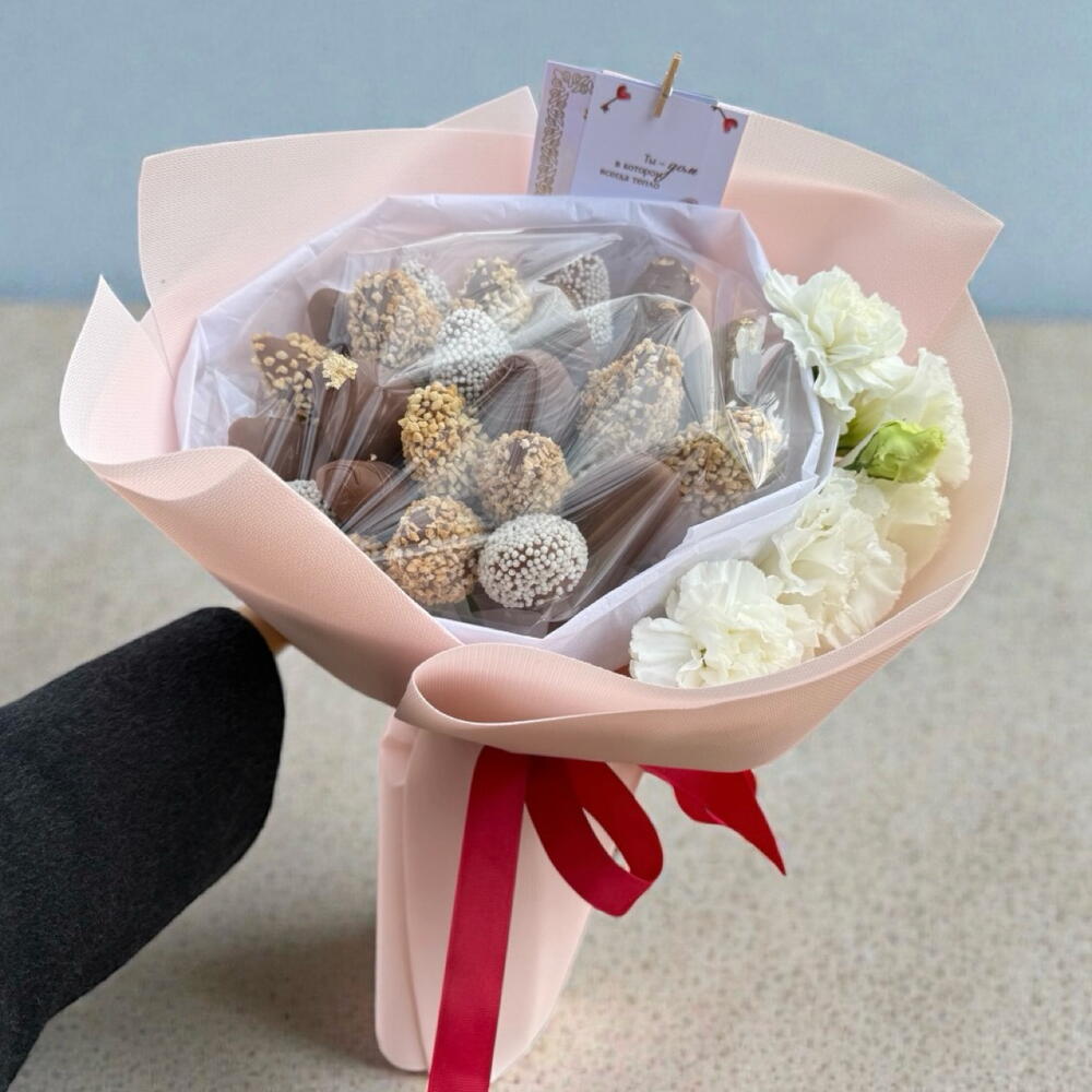 Лизиантус Белый - 3 шт. Диантус белый - 2 шт. Клубника в шоколаде - 10 шт. клубника в шоколаде с посыпками - 10 шт.