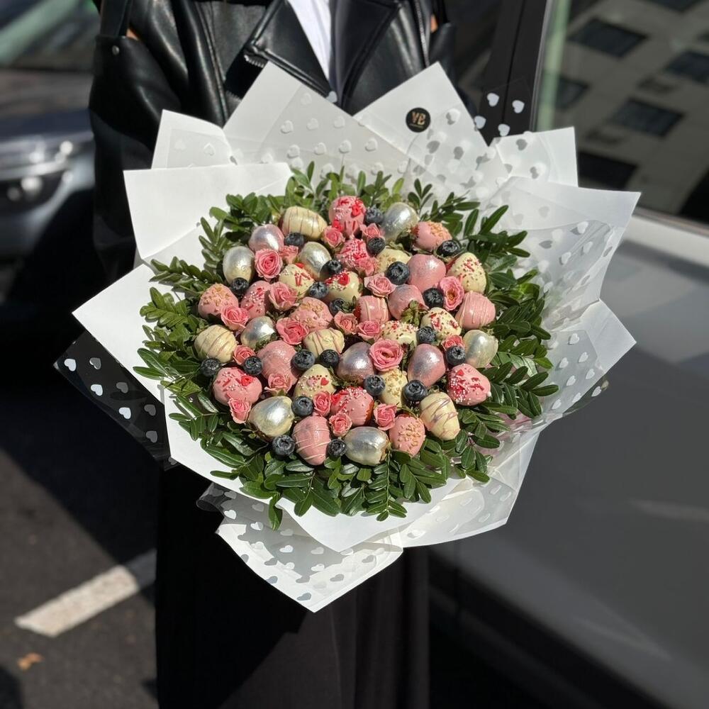 Изысканный букет с клубникой в шоколаде – идеальный подарок для тех, кто ценит необычные и сладкие сюрпризы. 🌺 Сочные ягоды, изысканно уложены в композицию, которая радует глаз и дарит настоящий гастрономический восторг. 🤩 Этот букет не только впечатляет своим видом, но и обещает незабываемые вкусовые ощущения. Подарите момент радости и удовольствия своим близким!