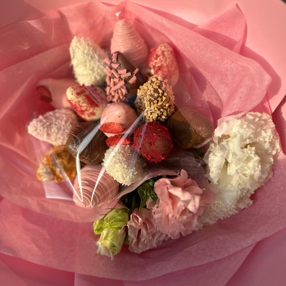Клубника в шоколаде callebaut (бельгия) - 15 шт. цветы лизиантус - 3 шт.