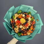 Роскошный букет из орехов и сухофруктов, утопающий в изумрудной упаковке. Яркие акценты из сушеных фруктов и свежей зелени создают гармоничное сочетание вкуса и эстетики, делая его идеальным подарком для ценителей натуральных лакомств.