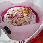 Коронованный букет из натурального мягкого нежного зефира идеально к любому напитку. Подойдёт как дополнение к подарку или как самостоятельный подарок. Цветы выполнены деталезированно не отличить от настоящих. Цветовая гамма как цветов так и упаковки обширная и оговоривается отдельно. При изготовление используется яблочное пюре, яйца, агар агар, сахар.