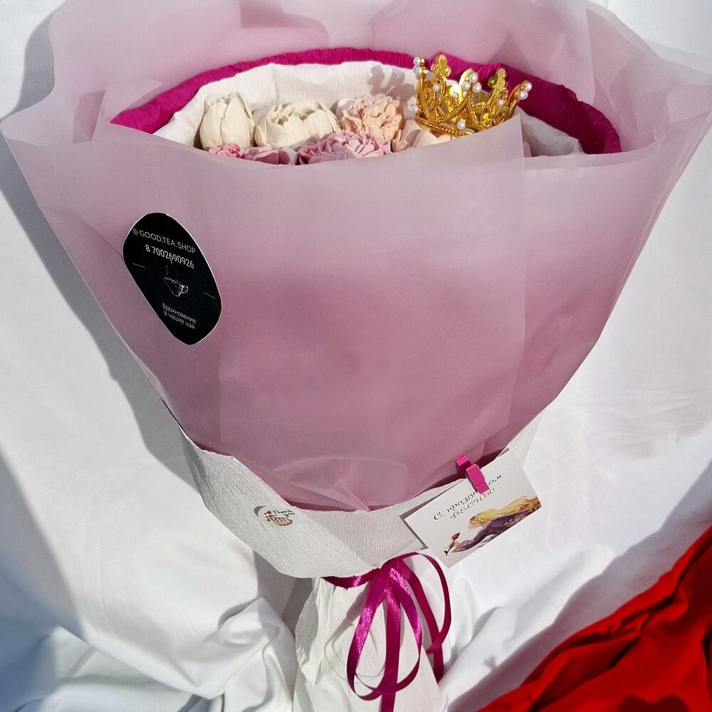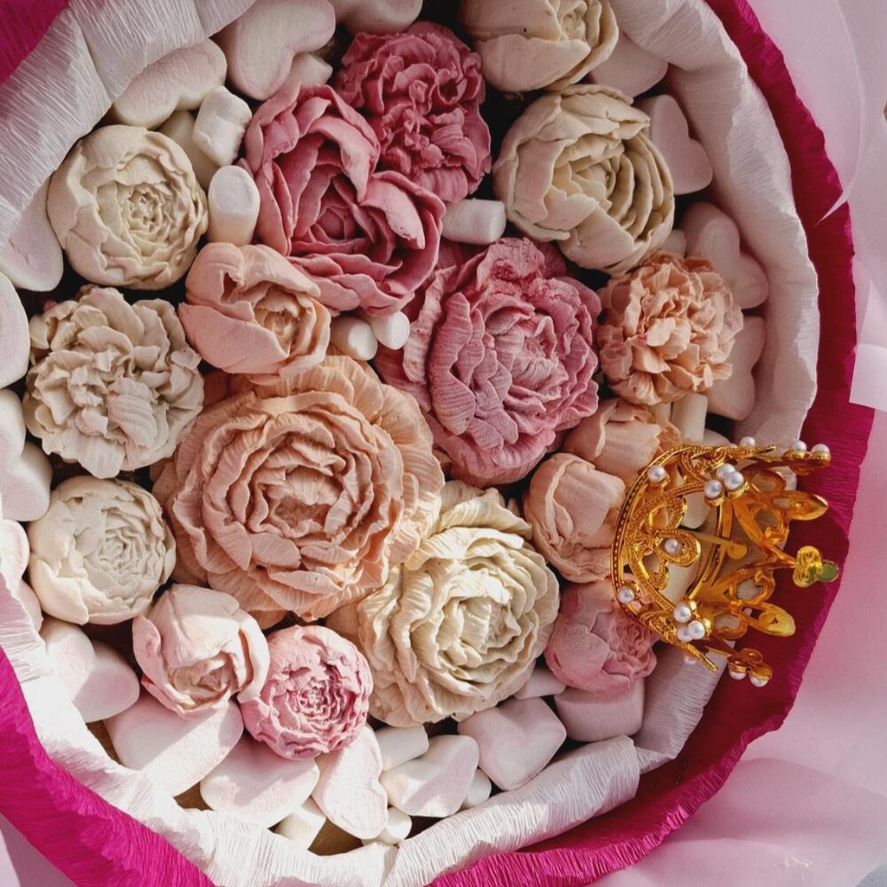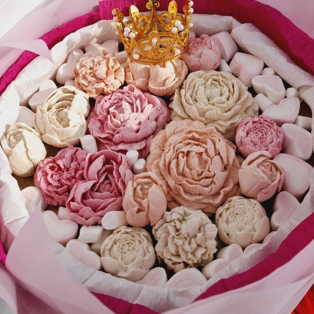 Коронованный букет из натурального мягкого нежного зефира идеально к любому напитку. Подойдёт как дополнение к подарку или как самостоятельный подарок. Цветы выполнены деталезированно не отличить от настоящих. Цветовая гамма как цветов так и упаковки обширная и оговоривается отдельно. При изготовление используется яблочное пюре, яйца, агар агар, сахар.