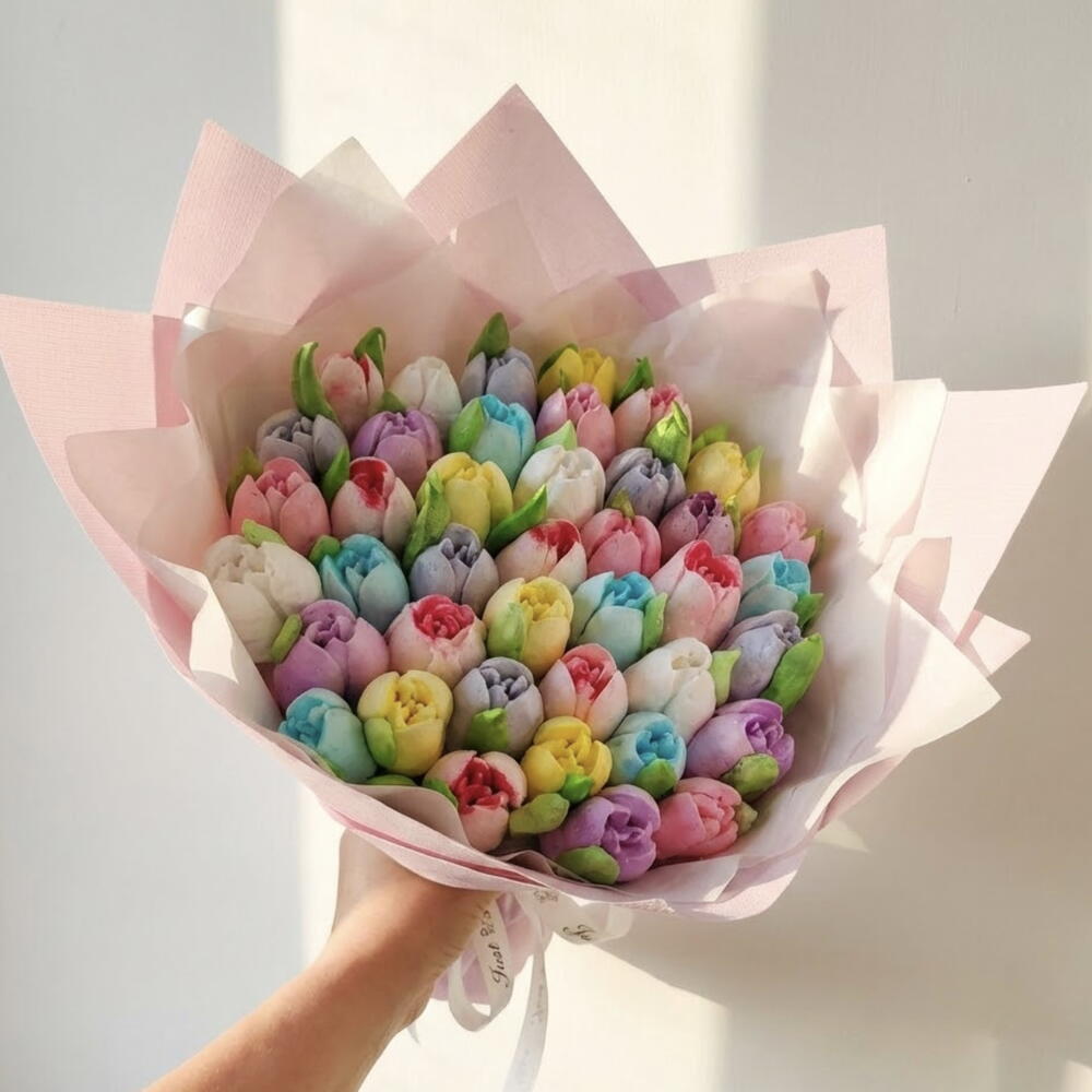 Букет из зефирных тюльпанов «Весеннее ассорти» — это нежный и яркий съедобный букет ручной работы, выполненный в виде аккуратных тюльпанов из натурального зефира. Композиция собрана в пастельных и насыщенных оттенках, создавая эффект свежего весеннего букета, который выглядит как настоящий, но при этом полностью съедобен. Букет станет прекрасным подарком на день рождения, 8 Марта, День матери, детский праздник или в качестве милого сладкого комплимента. Благодаря вкусу ассорти из семи видов зефира он понравится как взрослым, так и детям. Этот букет часто выбирают те, кто ищет букеты из зефира, съедобные цветы и оригинальные сладкие подарки ручной работы.