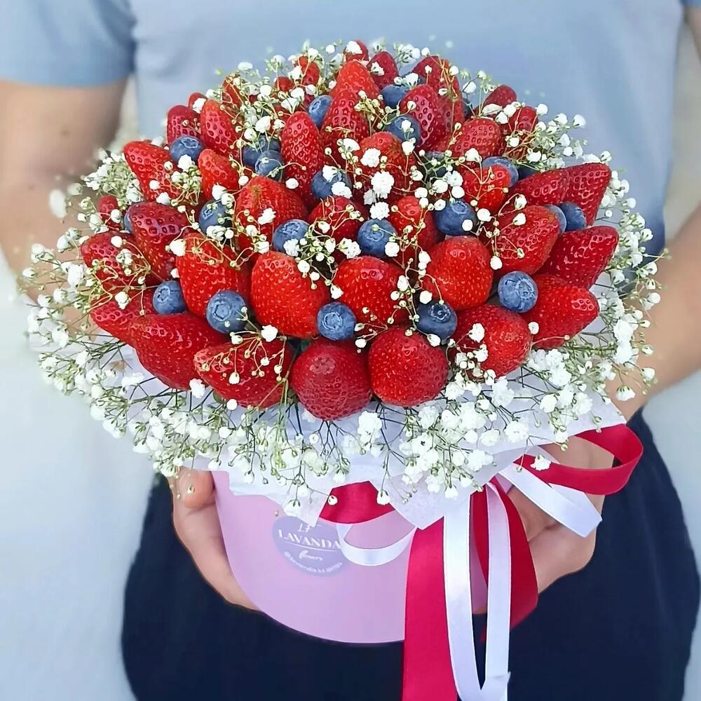 Гипсофила - 2 шт. Клубника - 37 шт. Коробка шляпная - 1 шт. Голубика - 17 шт.
