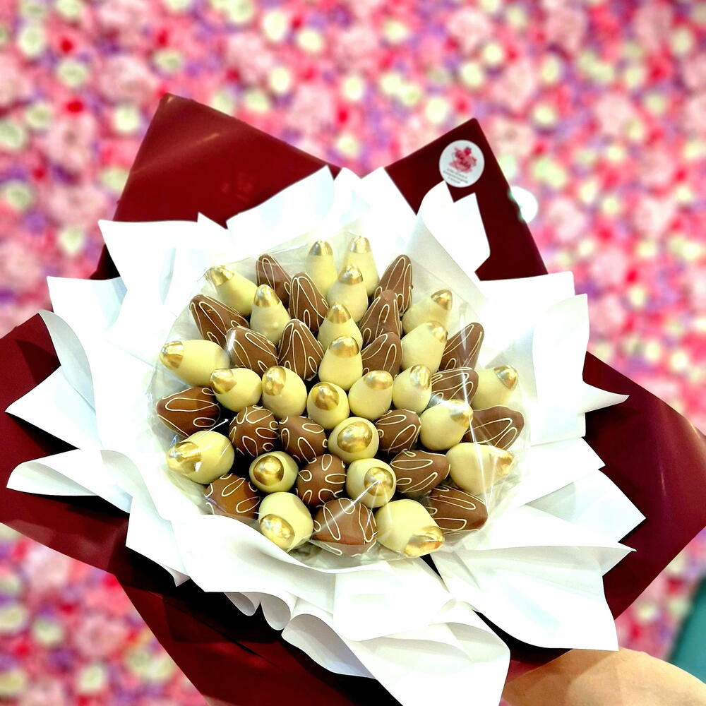 Этот изысканный букет из клубники - настоящее произведение искусства. Свежая, вкуснейшая клубника, аккуратно об dipped в мантию бельгийского шоколада Barry Callebaut, станет не только радостью для глаз, но и наслаждением для ваших вкусовых рецепторов. Композиция состоит из 25 ягод, покрытых нежнейшим белым и 18 - традиционным шоколадом, создавая изысканный вкусовой букет. Подарите этот роскошный десерт любимым и близким или устройте себе королевский угощение!