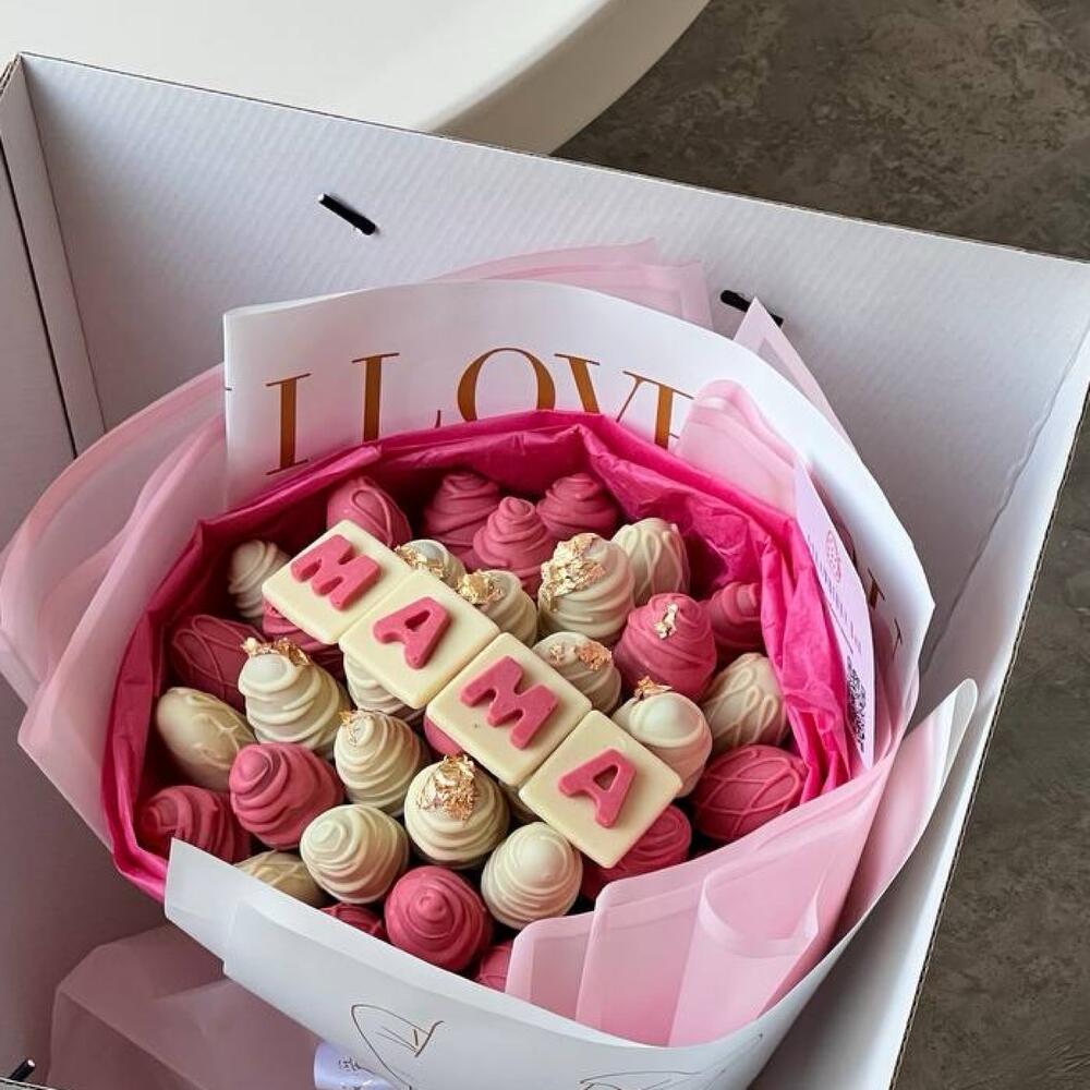 Нежный и трогательный букет, созданный специально для самых любимых — для мамы. В композиции собраны свежие ягоды клубники в белом и розовом шоколаде, украшенные узорами и золотыми акцентами, а в центре расположены шоколадные плиточки с надписью МАМА. Романтичное оформление в розовых тонах придаёт букету праздничное настроение и делает его идеальным подарком ко Дню матери, дню рождения или просто в знак благодарности. Такой сладкий презент не только порадует глаз, но и подарит вкусное удовольствие. Для сохранения свежести рекомендуется хранить букет в холодильнике и употребить в течение 24–48 часов.