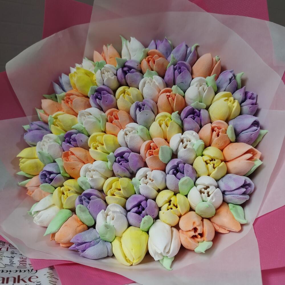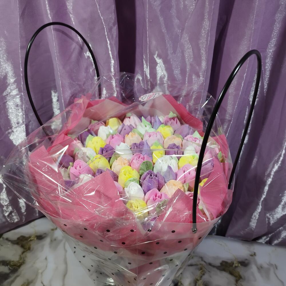 Количество цветов в букете примерно 50-55 штук. 4 вкуса зефира: банан, манго, черная смородина, яблоко-ваниль.