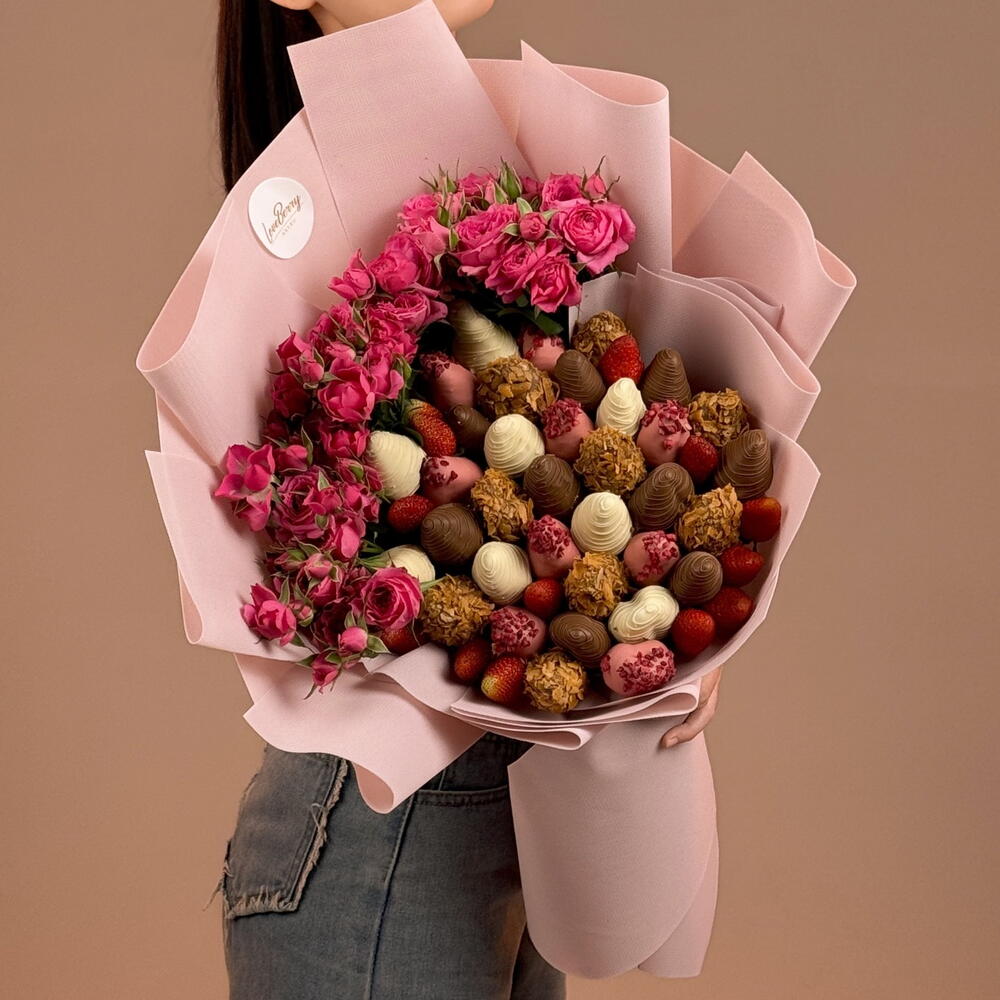 Роскошный букет из свежей клубники в бельгийском шоколаде и живых роз. Эффектный подарок для особого повода или чтобы сказать о своих чувствах без слов.