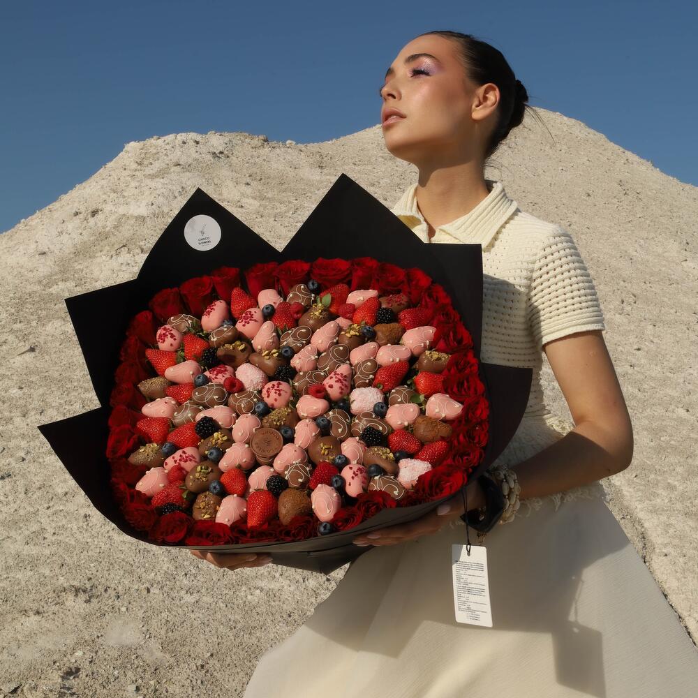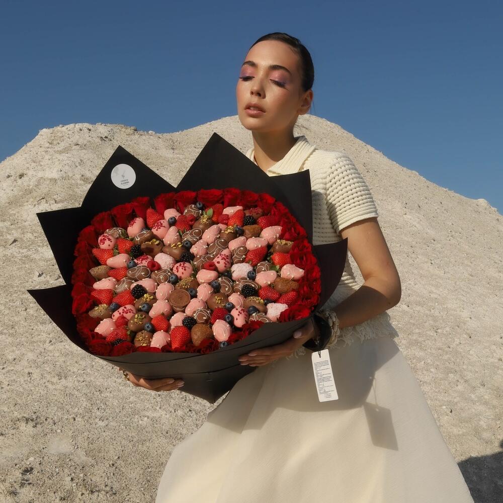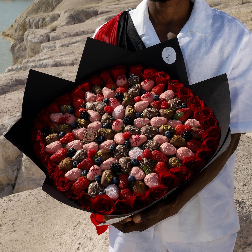 Шоколад ручной работы - 1 шт. свежая клубника - 15 шт. свежая малина - 45 гр. свежая голубика - 45 гр. свежая ежевика - 45 гр. клубника в шоколаде ассорти - 70 шт. свежая ветка красной смородины - 3 шт. цветы:красные розы - 35 шт.