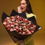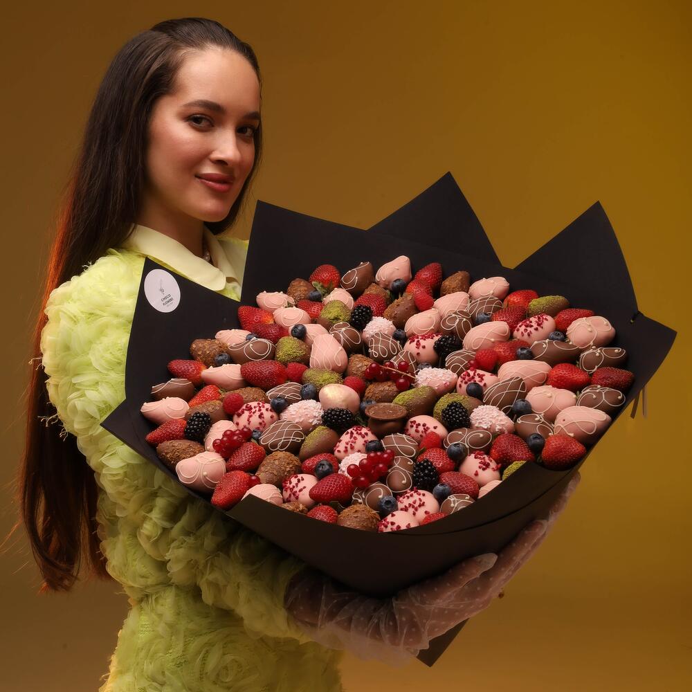 В дополнении используются посыпки: фисташка, сублимированная малина,вафельная крошка В букете присутствуют 80% клубник в шоколаде, 20% свежих клубник, также ягоды: малина, голубика, ежевика и смородина Количество клубник в букете зависит от размера самой клубники.