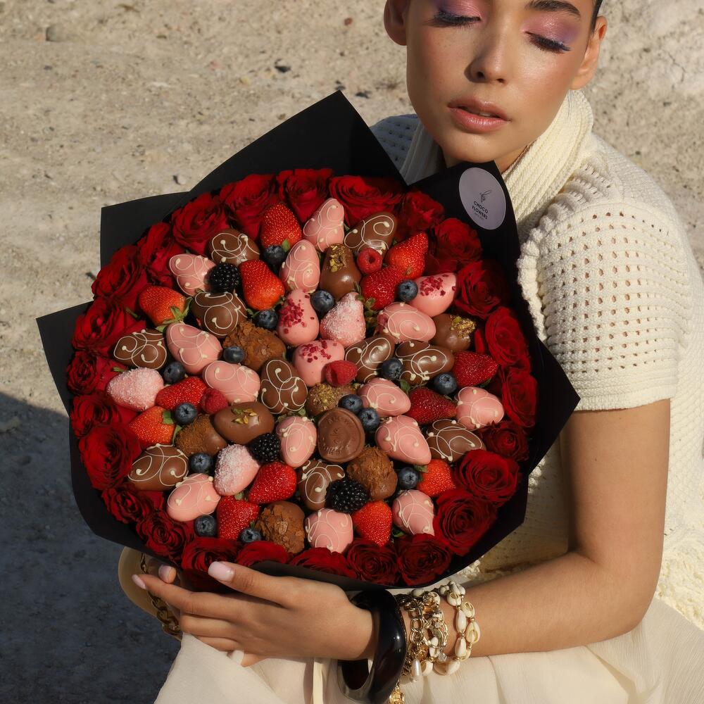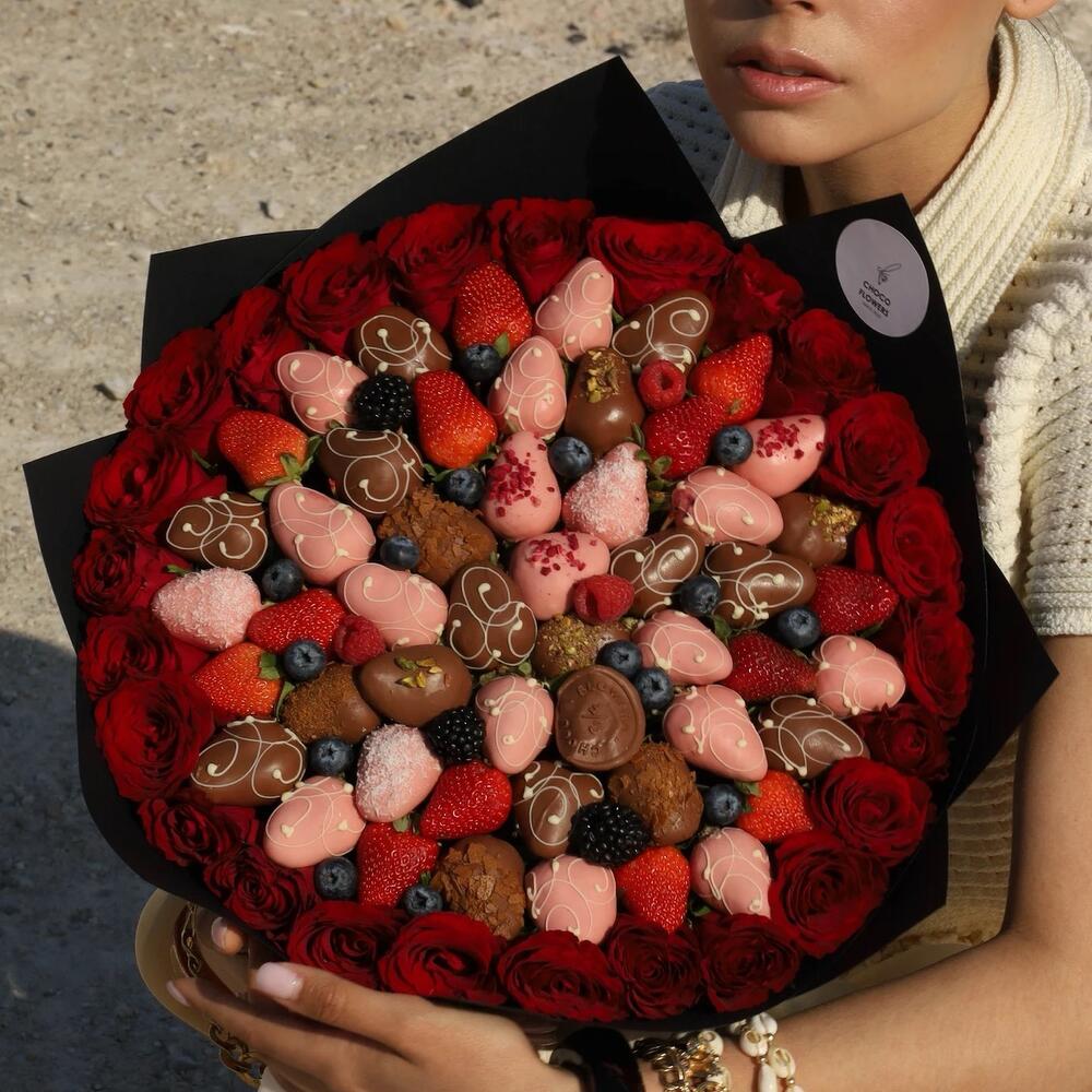 Шоколад ручной работы - 1 шт. свежая клубника - 15 шт. свежая малина - 45 гр. свежая голубика - 45 гр. свежая ежевика - 45 гр. свежая ветка красной смородины - 2 шт. клубника в молочном и розовом шоколаде - 25 шт. цветы:красные розы - 23 шт.