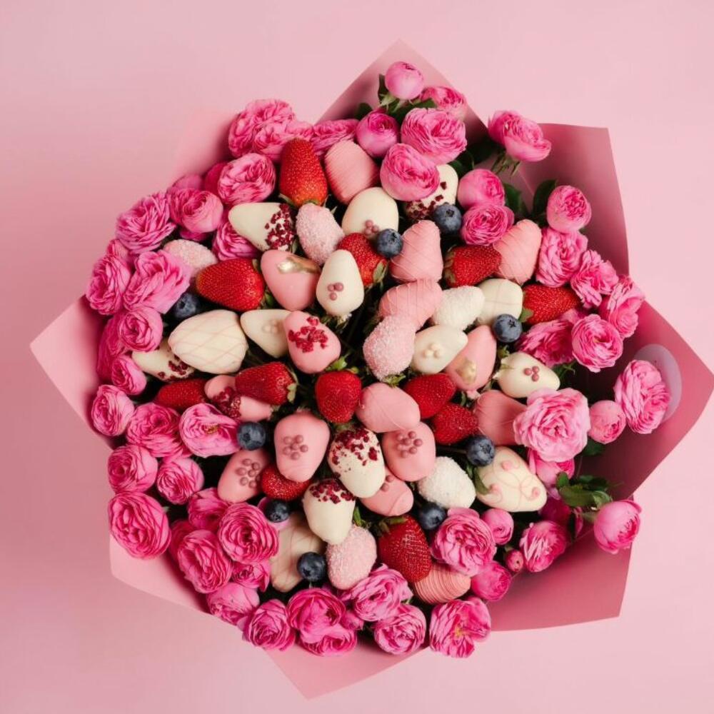 Этот букет собрал в себе всю нежность и изысканность. Составляют его 25 штук ароматных кустовых роз, наполняющих пространство волшебным разнообразием оттенков. Они дополнены 30 яркими красными ягодами клубники, утопающими в белом и розовом шоколаде, которые придают композиции необыкновенный вкус и аромат. 8 штук сочной черники и 8 штук сладкой голубики придают кому-то нужную кислоту и яркую выразительность. Этот букет станет идеальным подарком и украшением любого праздника.