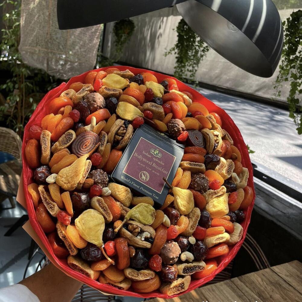 Кешью - 7 шт. Инжир - 20 шт. Вишня - 10 шт. Чай - 1 шт. Курага - 20 шт. Финики - 8 шт. дыня рулетик - 5 шт.