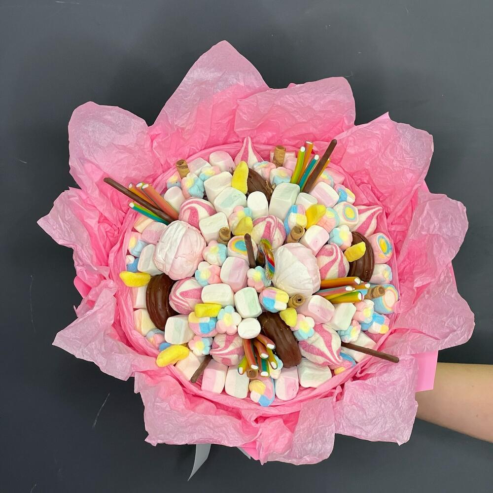 На фото изображён яркий и аппетитный сладкий букет, оформленный в розовую упаковочную бумагу.