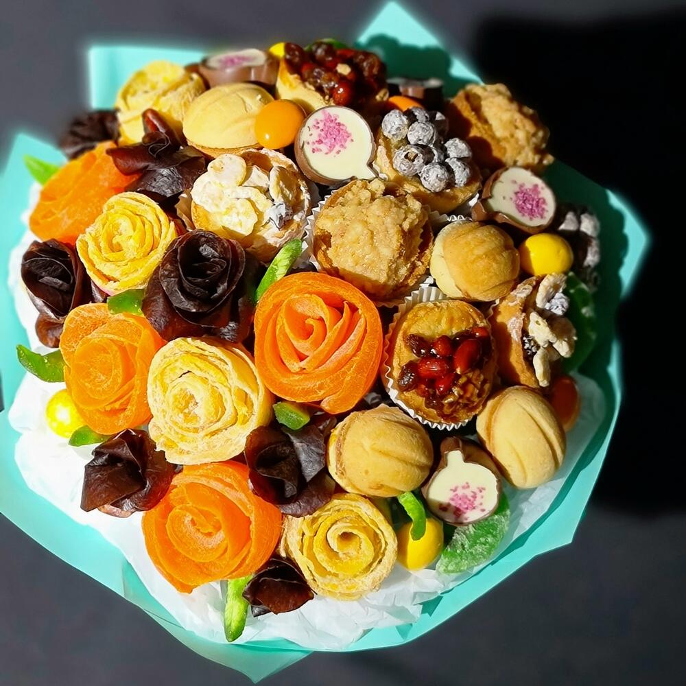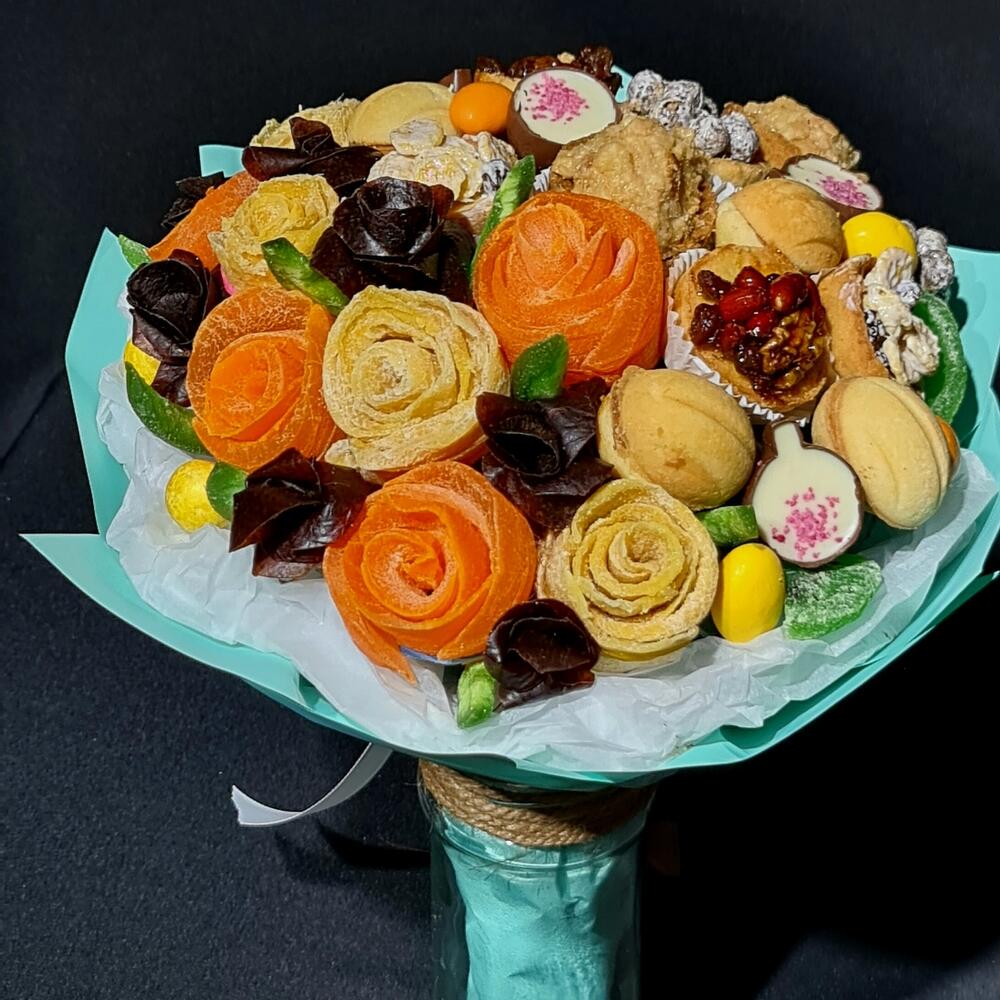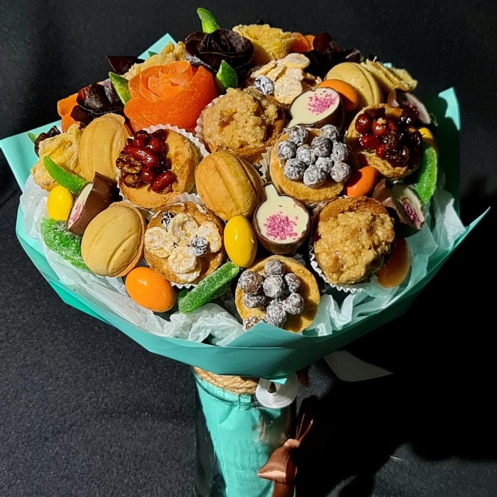 Шикарный букет к чаю! Розы из 2х видов Манго и пастилы, нежные, рассыпчатые тарталетки из песочного теста с разными начинками, драже и ароматные конфеты! Дополняют букет киви и помело! Этот букет покорит сердца! Остаётся заварить ароматный чай и наслаждаться душевными беседами в кругу близких! Приятного чаепития!