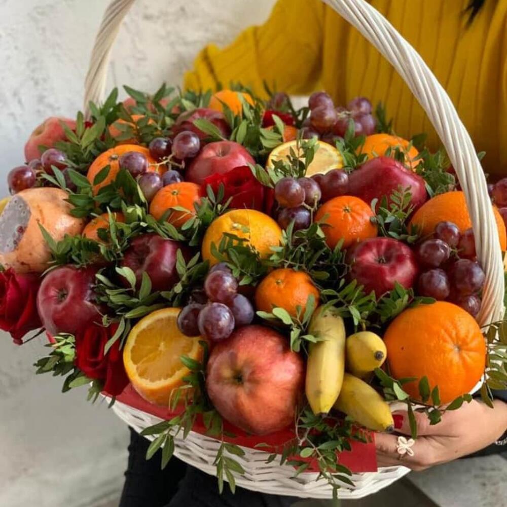 Виноград - 1 шт. Гранат - 1 шт. апельсины - 3 шт. бананы - 3 шт. розы - 5 шт. Яблоки - 5 шт. мандарины - 6 шт.