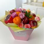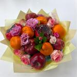 Роскошный фруктовый букет L — это сочетание сочных фруктов и нежных цветов в изысканном оформлении. Сочный гранат, ароматные яблоки, спелые мандарины и яркий апельсин наполняют букет насыщенными красками и свежим ароматом. Дополняют композицию изысканные розы и кустовые розочки, придавая ей романтичный и элегантный вид. Такой букет станет идеальным подарком на день рождения, юбилей, свадьбу или просто для поднятия настроения. Он объединяет в себе красоту природы, свежесть фруктов и утончённость цветочной эстетики.