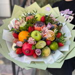 Альстромерия - 5 шт. Клубника - 15 шт. Роза - 5 шт. Гранат - 3 шт. Киви - 3 шт. Яблоко - 5 шт. Апельсин - 3 шт. Лайм - 2 шт. Персик - 5 шт. Упаковка дизайнерская - 2 шт. Голубика - 100 гр. зелень фисташки - 7 шт.