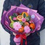 Роза кустовая - 3 шт. Рускус - 5 шт. Хризантема кустовая - 2 шт. Гранат - 1 шт. Киви - 2 шт. Яблоко - 3 шт. Апельсин - 2 шт. Мандарин - 2 шт. Груша - 1 шт. Упаковка дизайнерская - 2 шт. Грейпфрут - 1 шт.