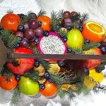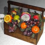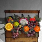 Ящик из высококачественного материала. Наполнен свежими фруктами и сухофруктами. Ёлку можно заменить на зелень. В ящик можно добавить спрейрозу ( 5 шт 1500). На ящик можно нанести гравировку ( от 1000 т)