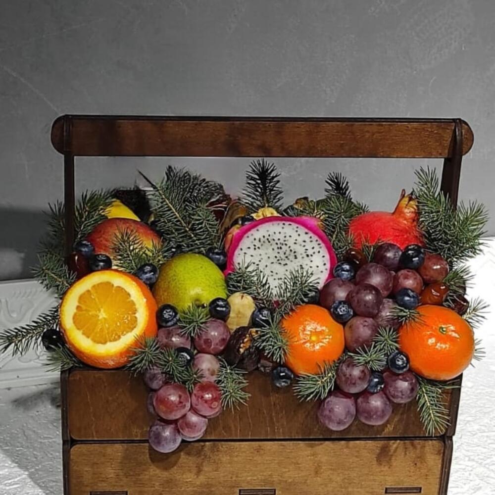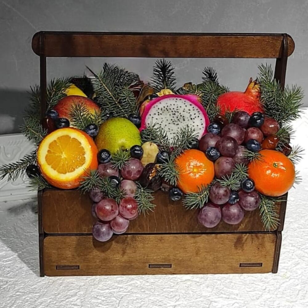 Ящик из высококачественного материала. Наполнен свежими фруктами и сухофруктами. Ёлку можно заменить на зелень. В ящик можно добавить спрейрозу ( 5 шт 1500). На ящик можно нанести гравировку ( от 1000 т)
