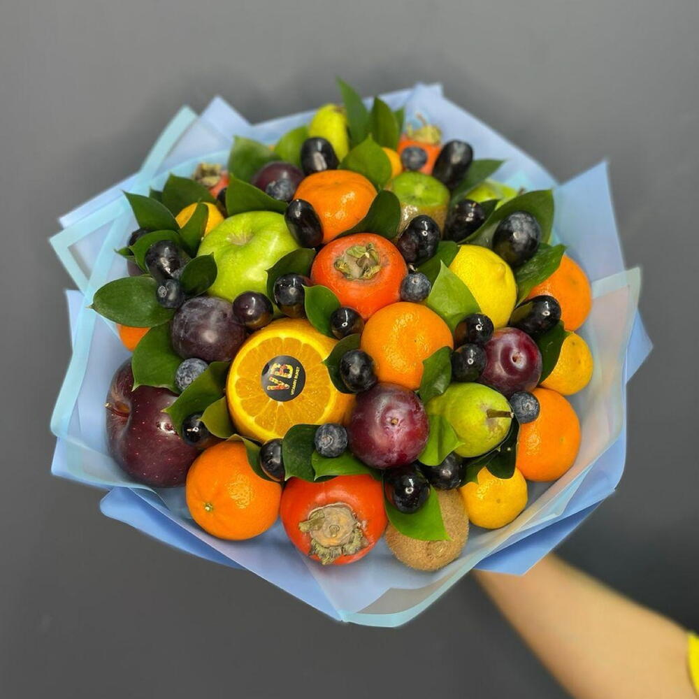 Киви - 2 шт. Апельсин - 1 шт. Мандарин - 6 шт. Лимон - 1 шт. Груша - 2 шт. Слива - 3 шт. Голубика - 30 гр. Хурма - 3 шт. яблоко красное - 2 шт. яблоко зеленое - 2 шт. виноград черный - 100 гр.