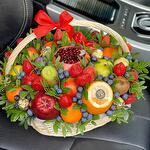 Клубника - 150 гр. Гранат - 1 шт. Киви - 3 шт. Апельсин - 2 шт. Груша - 2 шт. Слива - 3 шт. Голубика - 100 гр. Ferrero rocher - 5 шт. персики - 5 шт. Яблоки - 3 шт. мандарины - 3 шт. абрикосы - 7 шт.