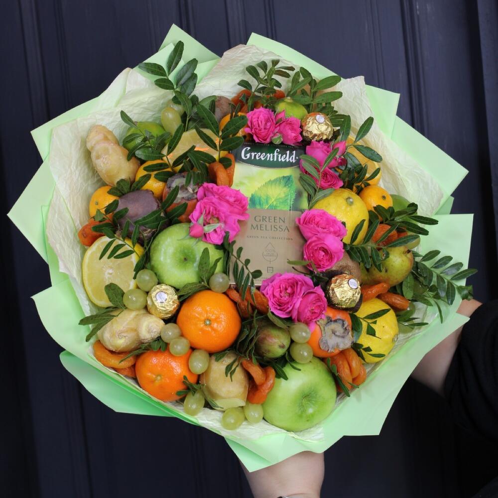 Лимон - 4 шт. Груша - 2 шт. Имбирь корень - 3 шт. Хурма - 3 шт. Чай - 1 шт. Ferrero rocher - 3 шт. Курага - 20 шт. Спрей роза - 2 шт. Виноград гроздь - 1 шт. Яблоки - 3 шт. мандарины - 5 шт.