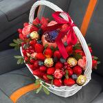 Клубника - 500 гр. Фисташка - 10 шт. Голубика - 15 шт. Конфеты Ferrero Rocher - 7 шт. Смородина - 3 шт. гранат красный - 1 шт. цветы - 5 шт. тутовник (ежевика) - 10 шт.