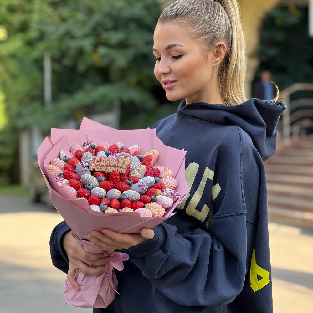 Клубника - 800 гр. Голубика - 70 гр. Шоколадные буквы - 1 шт. Клубника в шоколаде - 1000 гр.